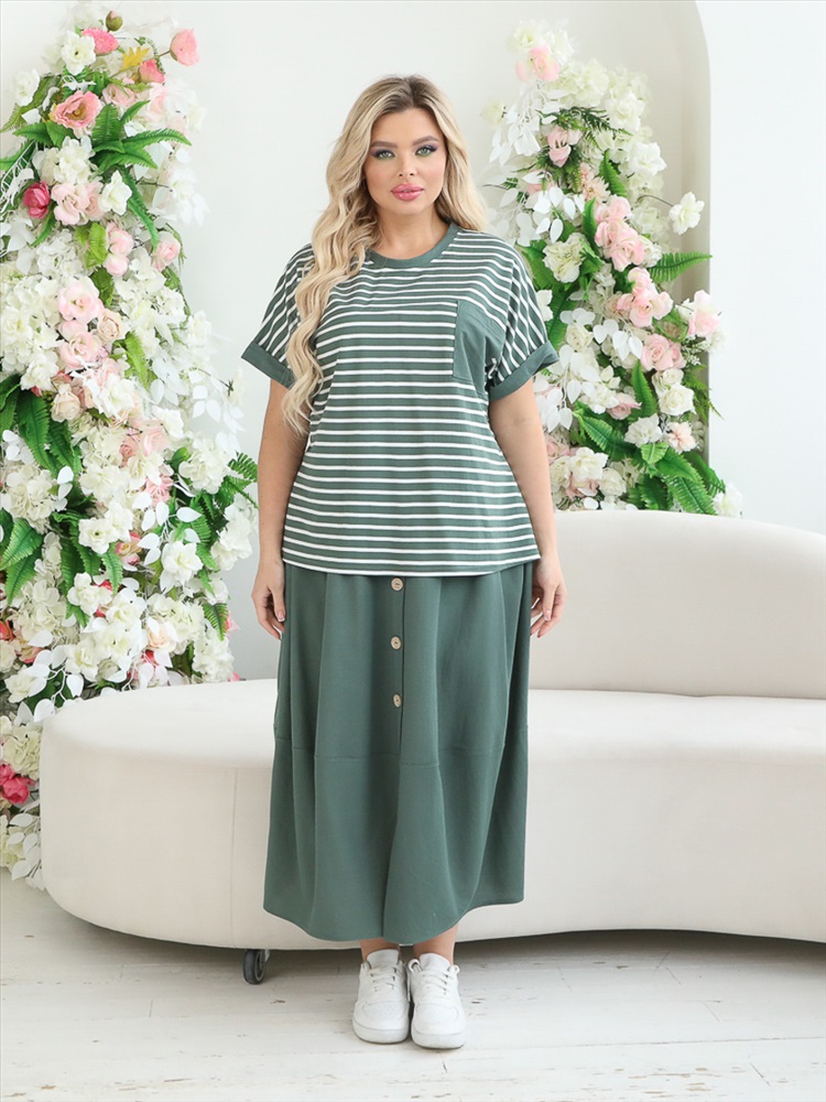 Стильный джемпер прямого силуэта из трикотажного полотна зелено-белого цвета. Круглый вырез изделия обработан широкой однотонной бейкой. Цельнокроеные рукава обработаны манжетами. Перед изделия дополнен накладным карманом. Длина изделия по спинке от плечевого шва до низа изделия - 65 см. Рост фотомодели - 170 см.
