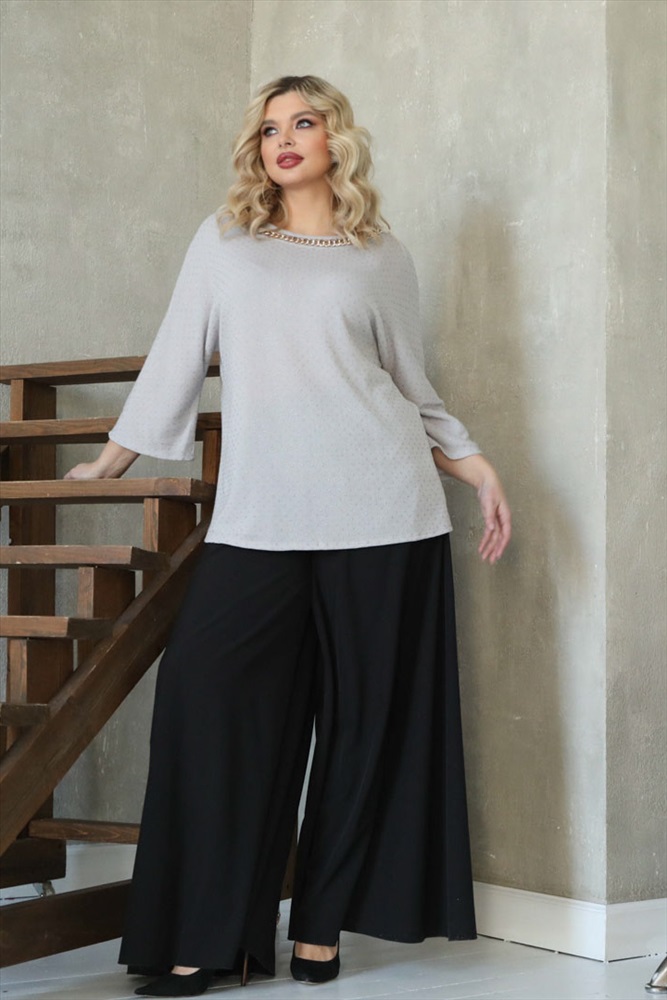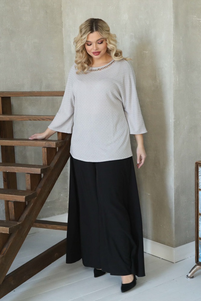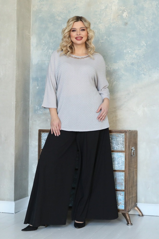 Изящный джемпер свободного силуэта из трикотажного полотна серого цвета с металлическим напылением. Круглый вырез изделия украшен декоративной цепочкой. Джемпер с цельнокроенными рукавами.