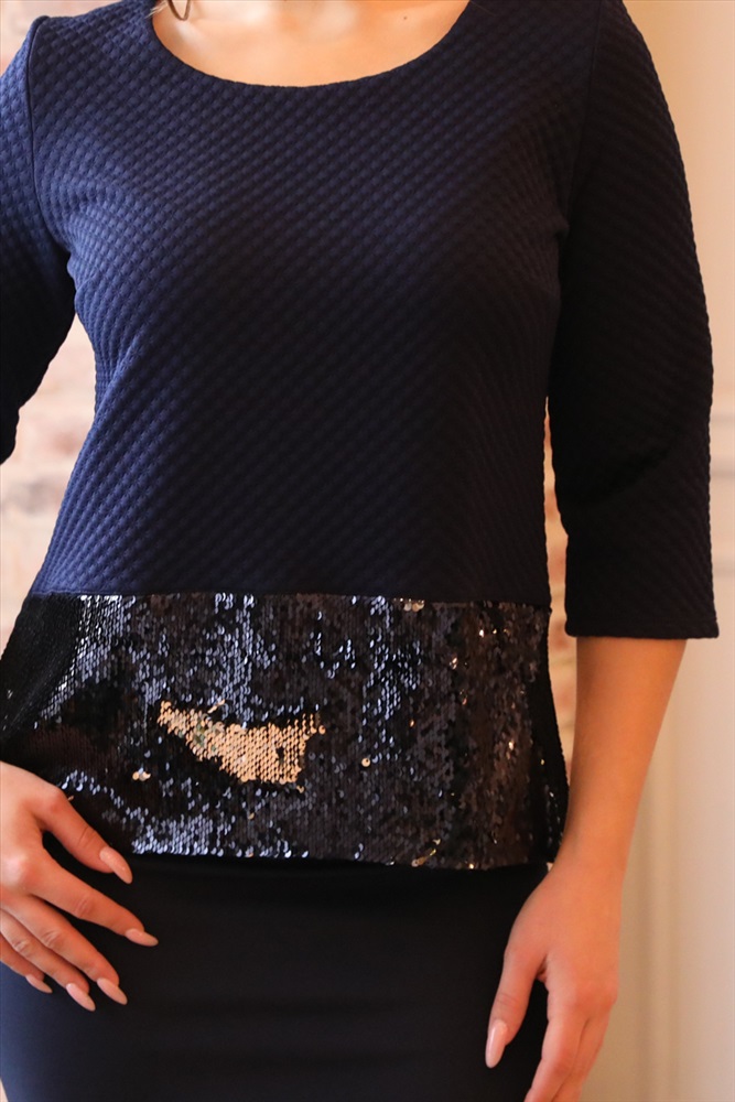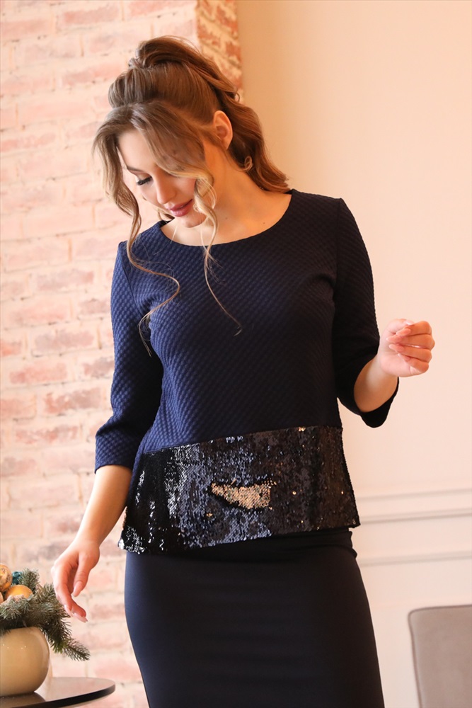 ШтрихКод: 4650333143996 По размеру: 42, 48 Состав: Полиэстер 95% Эластан 5% Скидка на сайте: 50% Срок готовности: 2017-10-08T00-00-00 Роскошный джемпер полуприлегающего силуэта из плотного трикотажного полотна синего цвета. Круглый вырез изделия обработан внутренней обтачкой. Джемпер с втачными рукавами. Перед изделия по низу дополнен широкой тесьмой из великолепного пайеточного полотна «хамелеона» ,меняющего цвет из серебряного на синий. Аксессуары в комплект не входят. Длина изделия по спинке от плечевого шва до низа изделия — 61 см. Комментарии к товару