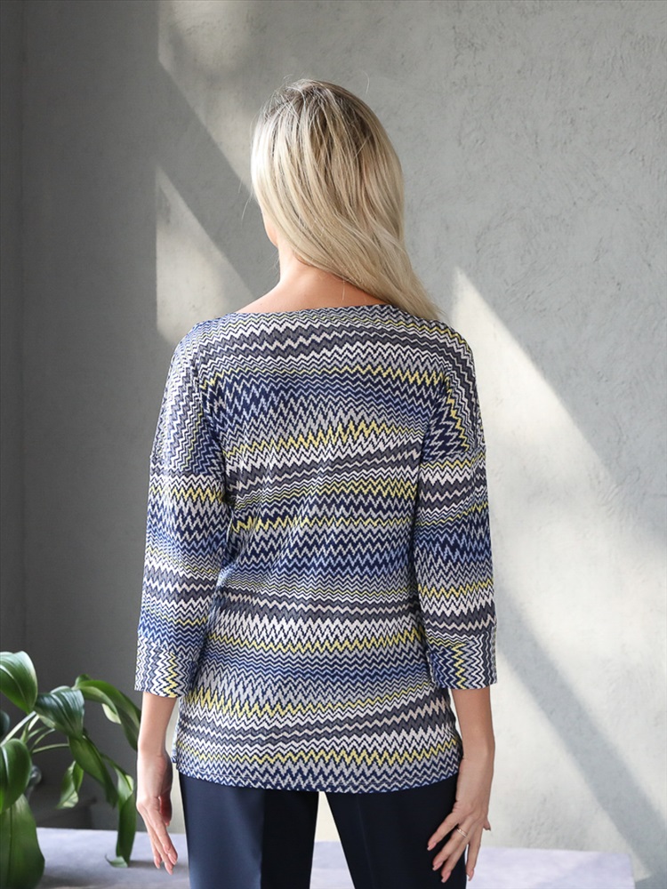 Стильный джемпер свободного силуэта из трикотажного полотна серо-синего цвета. Круглый вырез изделия обработан внутренней обтачкой. Низ втачных рукавов со спущенной линией проймы дополнен свободным манжетом. Перед джемпера по низу дополнен декоративным узлом.