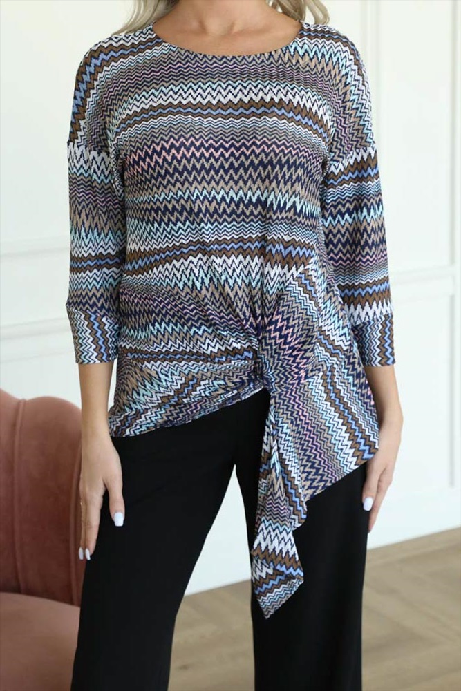 Стильный джемпер свободного силуэта из трикотажного полотна бежево-кораллового цвета. Круглый вырез изделия обработан внутренней обтачкой. Низ втачных рукавов со спущенной линией проймы дополнен свободным манжетом. Перед джемпера по низу дополнен декоративным узлом.
