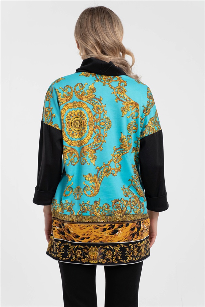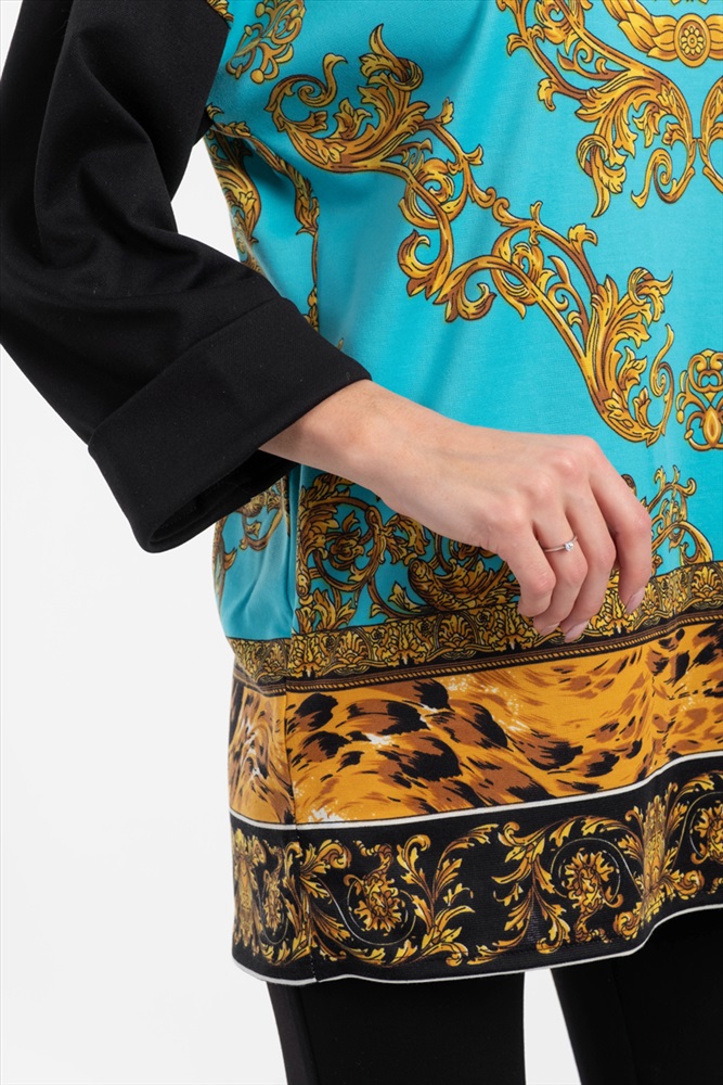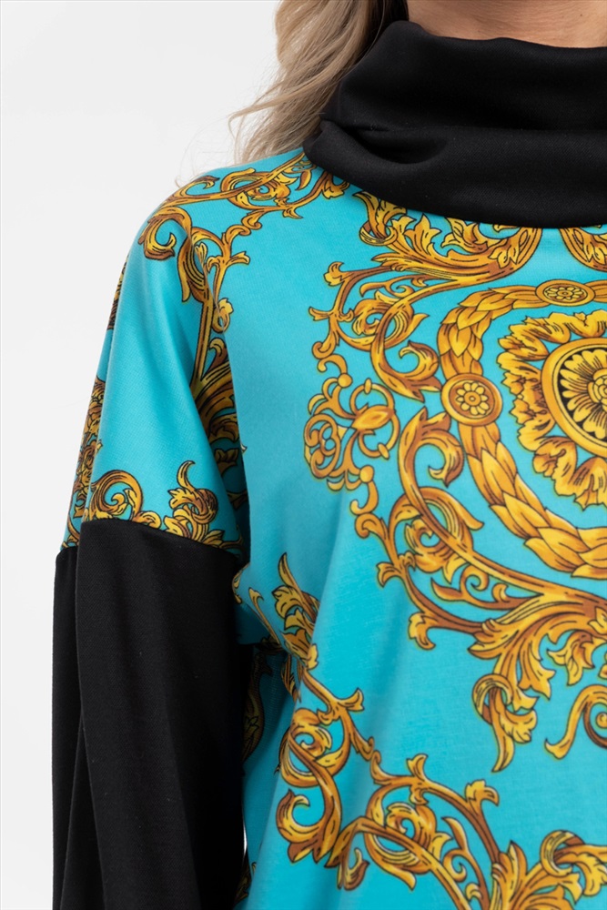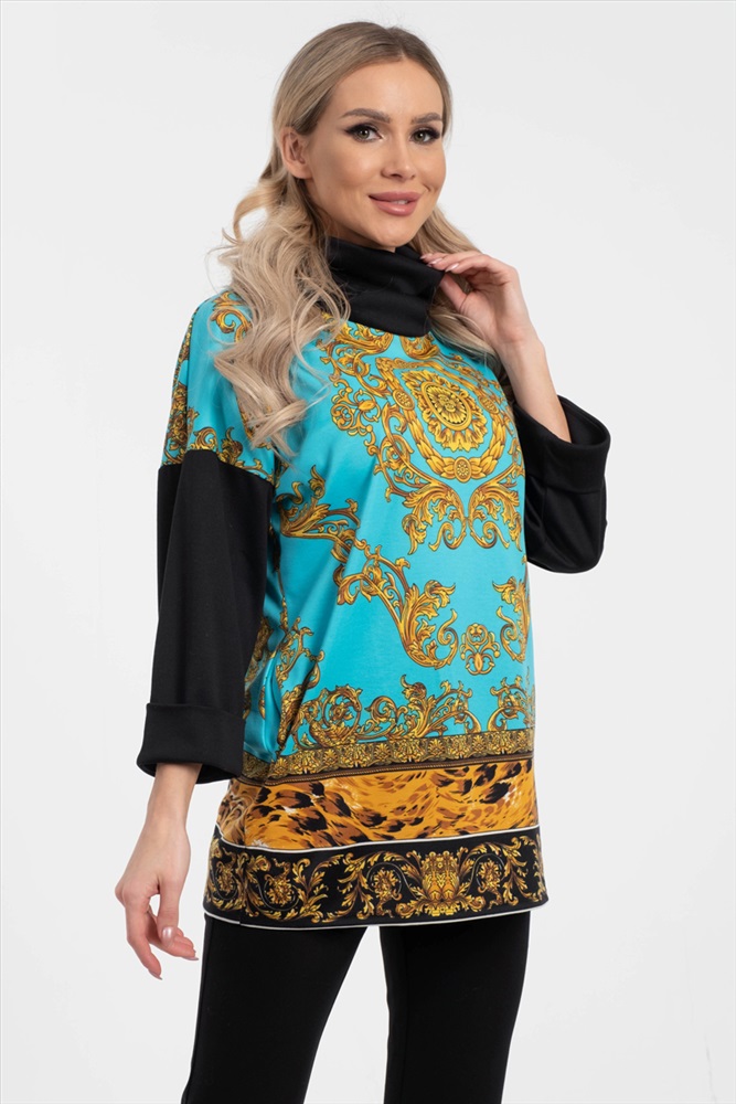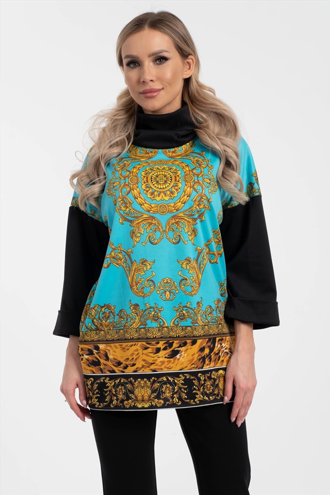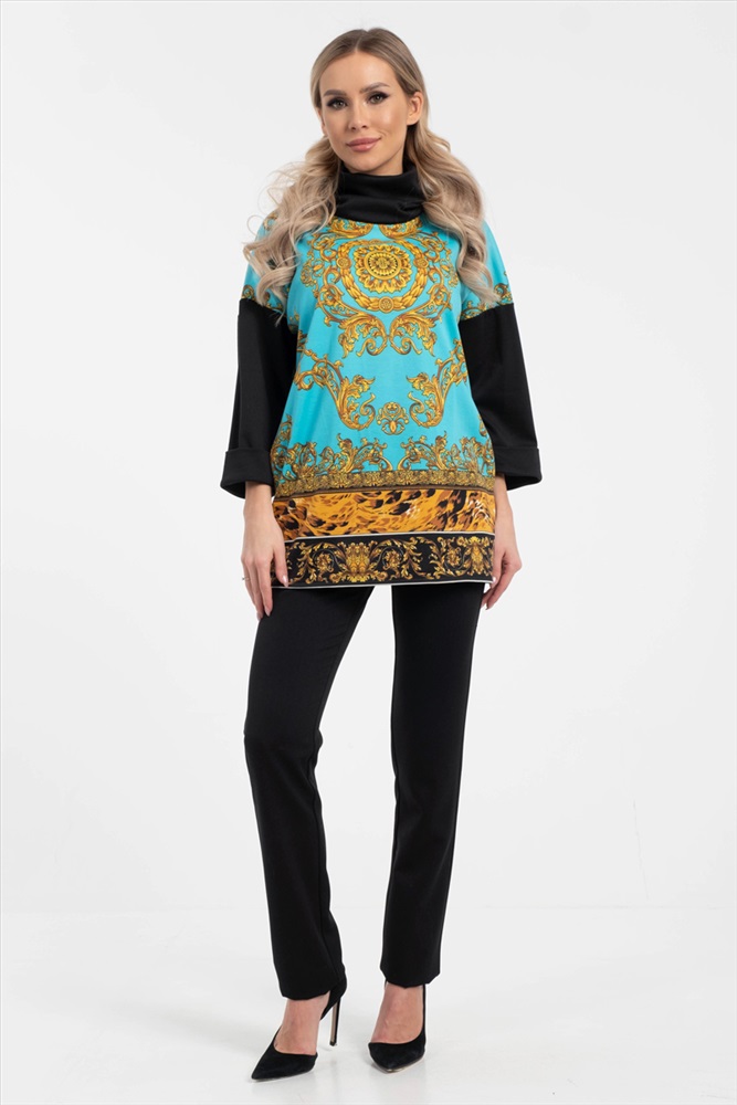 Яркий джемпер-туника свободного силуэта из трикотажного полотна с купонным рисунком бирюзового-желтого цвета. Воротник — хомут. Изделие со спущенной проймой и втачными рукавами.