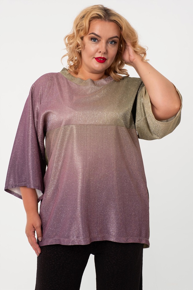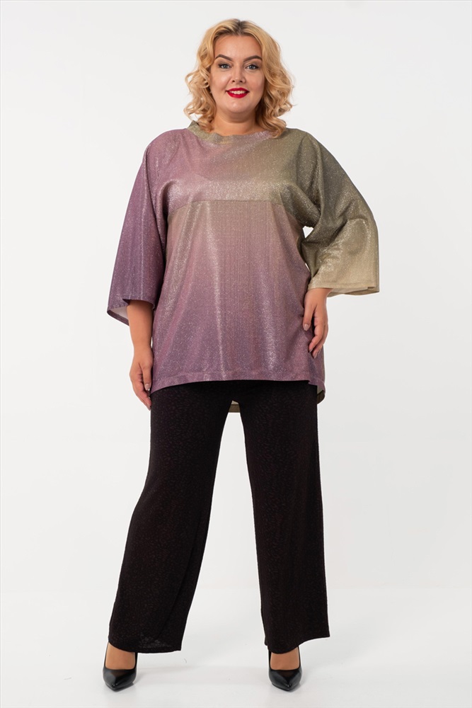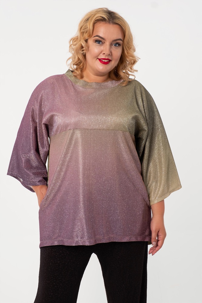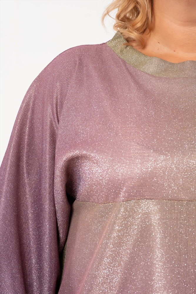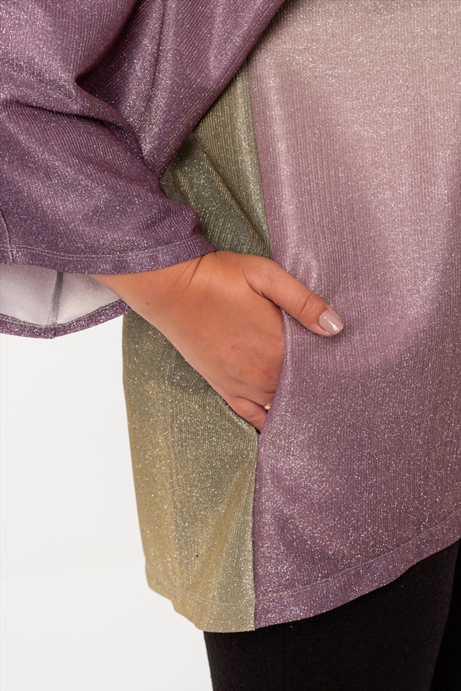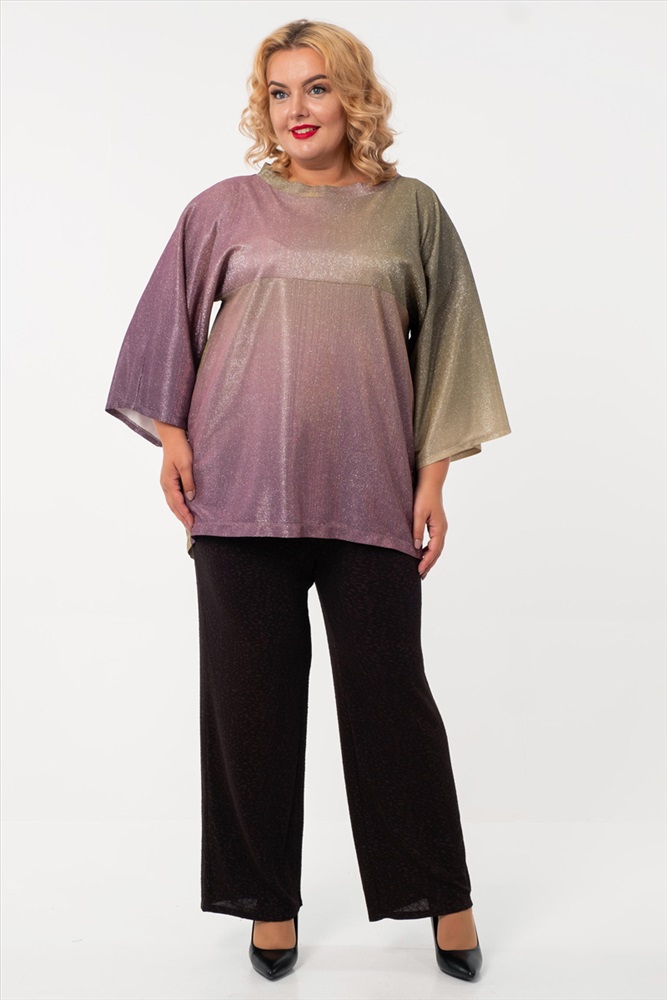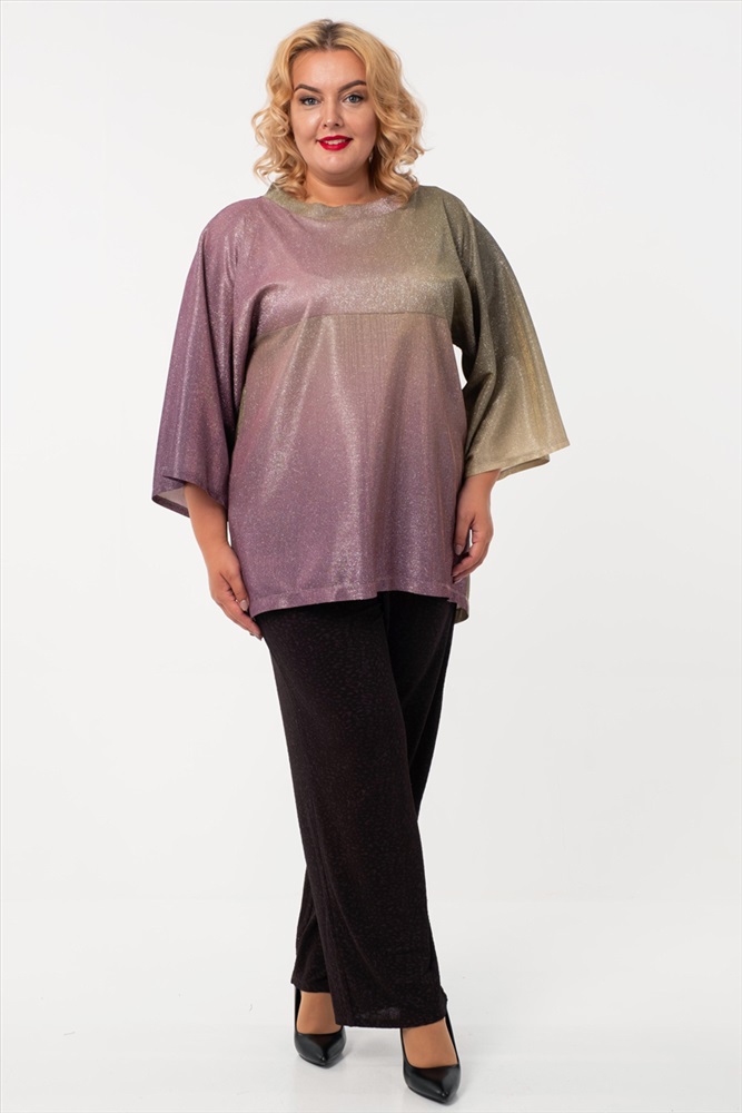 Эффектный джемпер-туника свободного силуэта из трикотажного полотна с металлическим блеском. Круглый вырез изделия обработан небольшим воротником-стойка. Джемпер-туника с широкими цельнокроеными рукавами. Изделие отрезное по линии груди. Длина изделия по спинке от плечевого шва до низа изделия — 76 см.