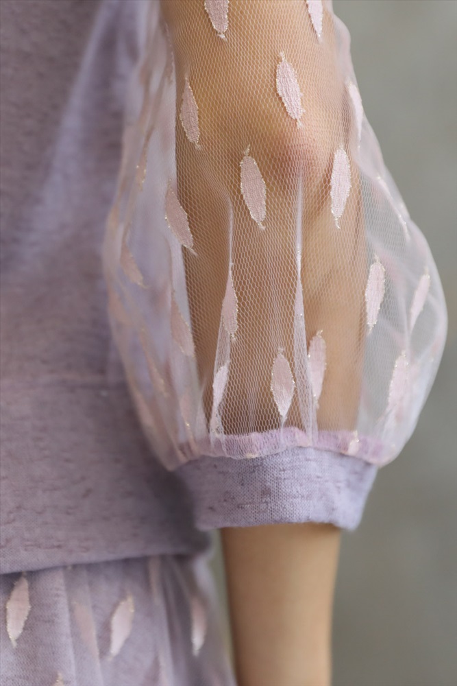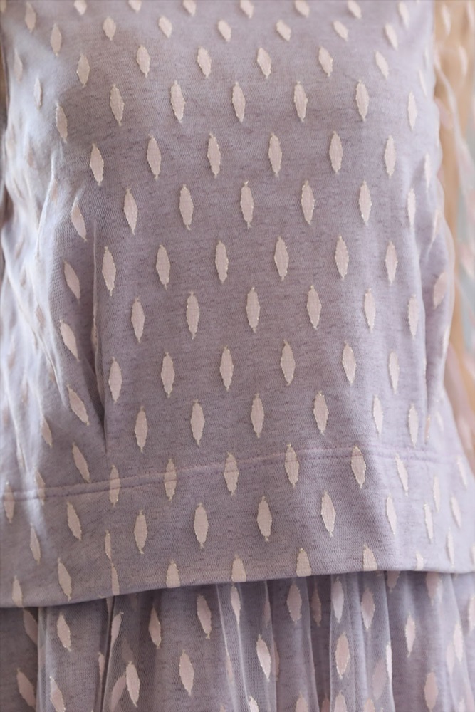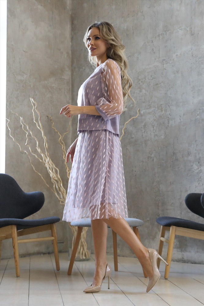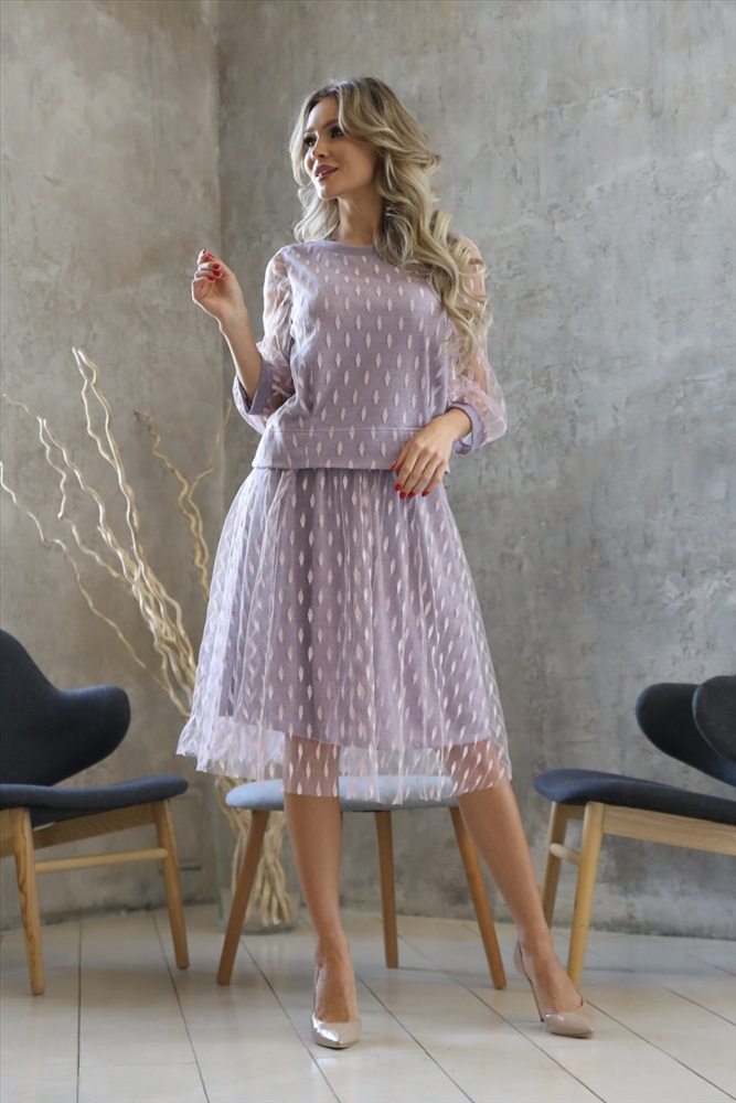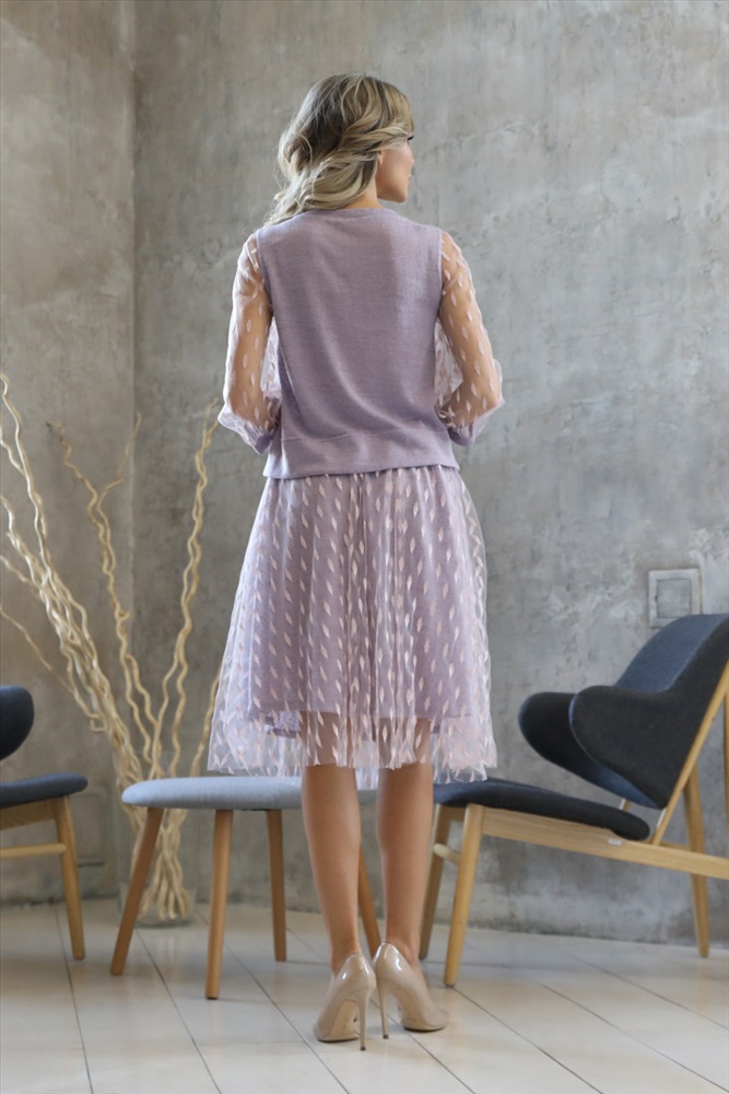 Роскошный джемпер полуприлегающего силуэта из трикотажного полотна грозового цвета. Перед джемпера двойной, кружево на трикотажном подкладе. Круглый вырез изделия обработан внешней обтачкой. Втачные рукава выполнены из кружева и обработаны манжетами. По низу изделия широкий манжет, который дополнен декоративной складкой. Длина изделия по спинке от плечевого шва до низа изделия - 51 см. Рост фотомодели — 170 см.