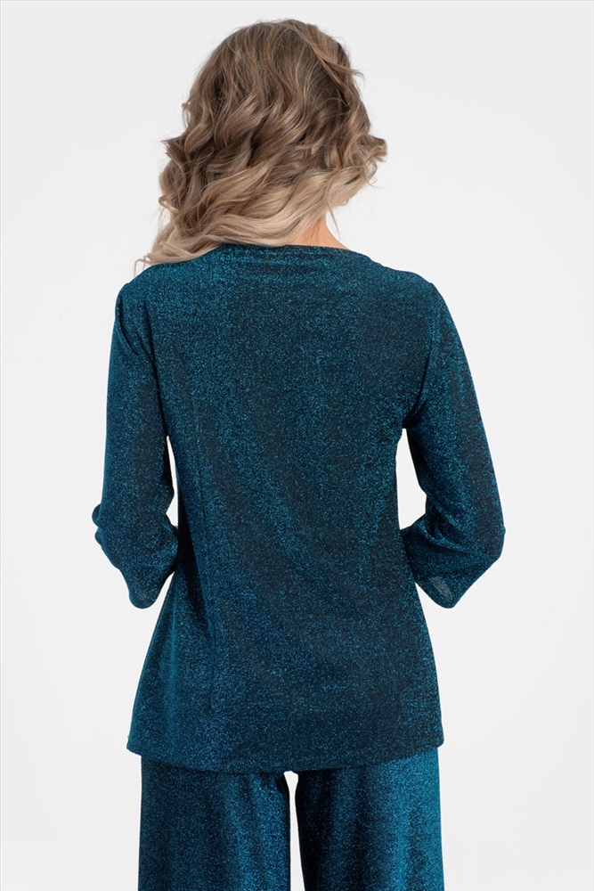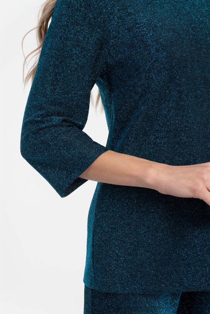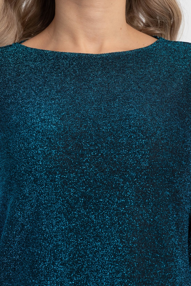 Очаровательный джемпер полуприлегающего силуэта из трикотажного полотна бирюзового цвета с металлическим блеском. Круглый вырез изделия обработан внутренней обтачкой. Джемпер с втачными рукавами. Длина изделия от плечевого шва по спинке до низа изделия — 58 см.