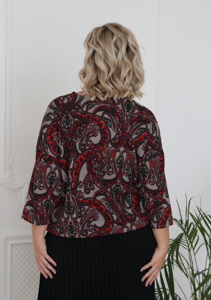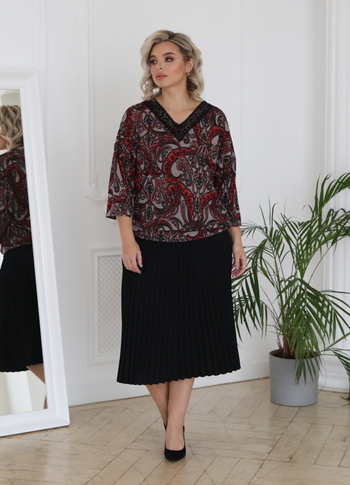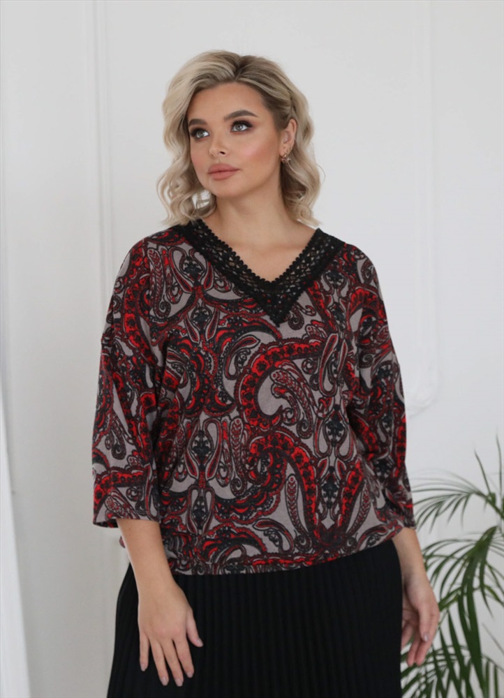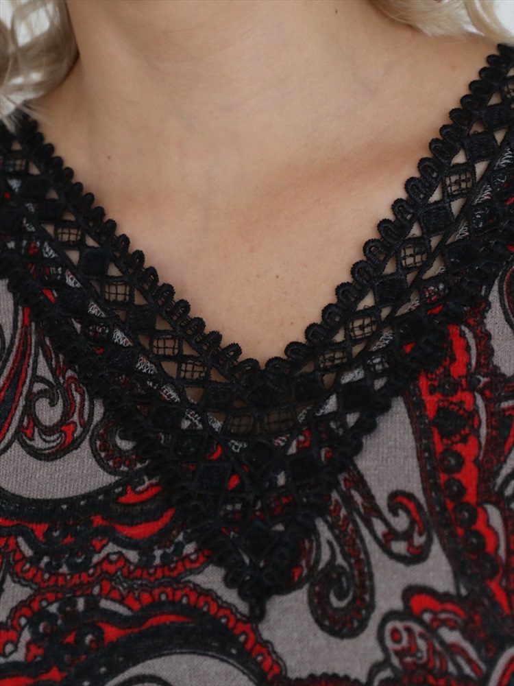 Уютный джемпер полуприлегающего силуэта из трикотажного полотна черно-красного цвета. V-образный вырез изделия украшен кружевом. По низу изделия — широкий манжет. Длина изделия по спинке от плечевого шва до низа изделия - 65 см. Аксессуары в комплект не входят. Рост фотомодели — 170 см