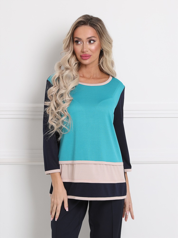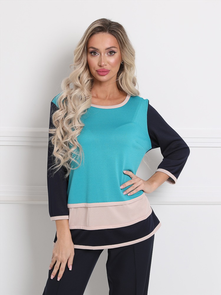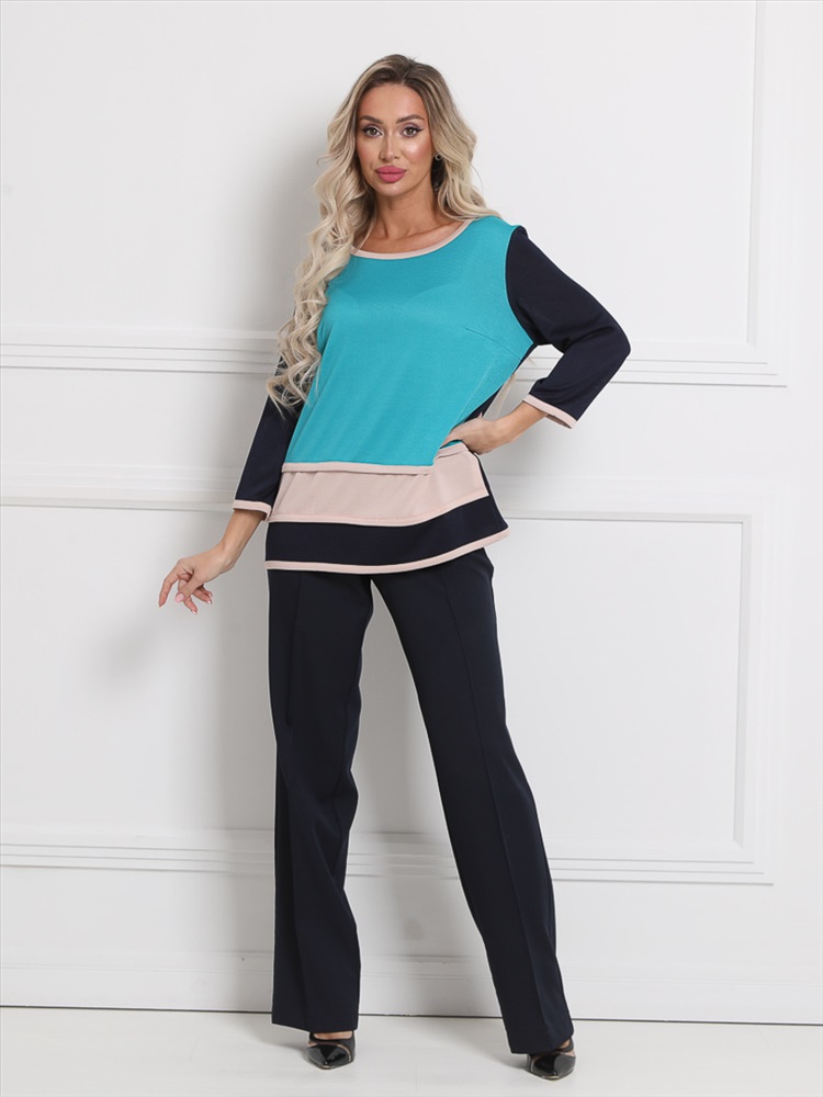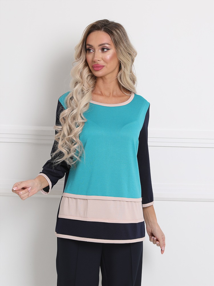 Очаровательный джемпер полуприлегающего силуэта из трикотажного полотна сине-голубого цвета. Круглый вырез изделия и втачные рукава обработаны однотонными окантовками. Длина изделия по спинке от плечевого шва до низа изделия - 59 см. Рост фотомодели — 170 см