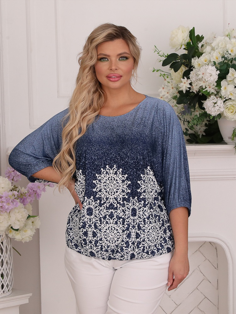 Женственный джемпер полуприлегающего силуэта из трикотажного полотна сине-белого цвета. Круглый вырез изделия обработан окантовкой. Цельнокроеные рукава и по низу изделия обработаны резинкой. Длина изделия по спинке от плечевого шва до низа изделия - 63 см. Рост фотомодели - 170 см..