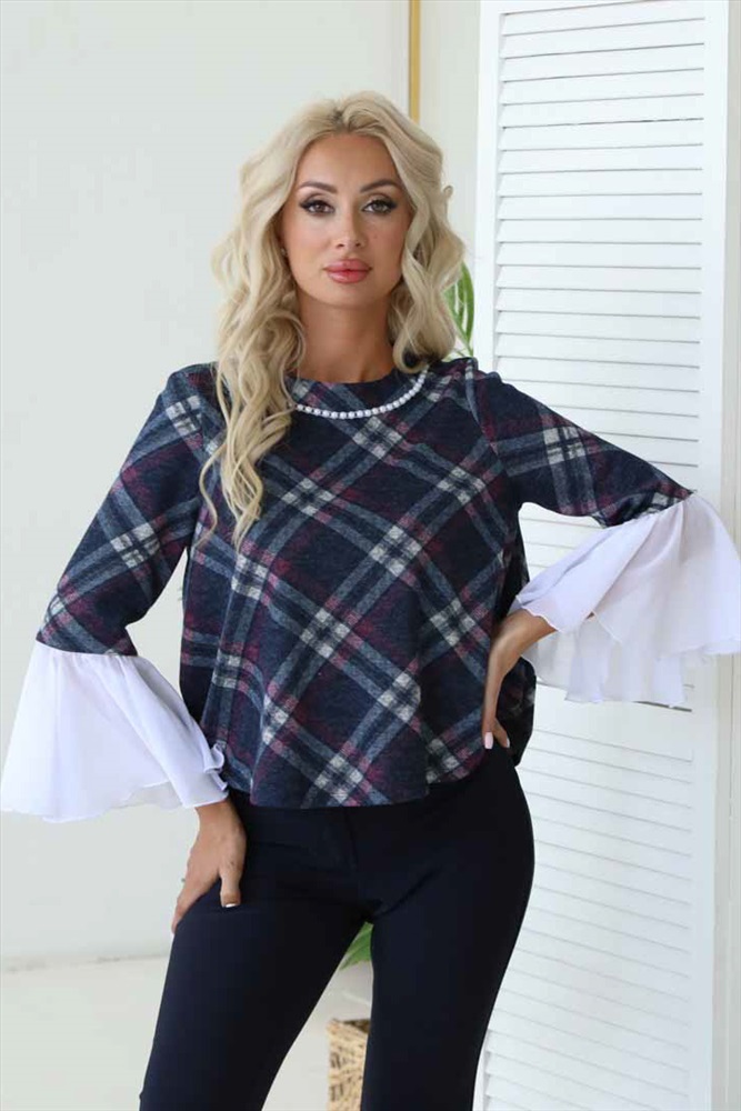 Роскошный джемпер свободного силуэта из трикотажного полотна серо-красного цвета. Круглый вырез изделия обработан внутренней обтачкой и украшен декоративным украшением. По низу втачных рукававов — широкие оборки. Длина изделия по спинке от плечевого шва до низа изделия — 54 см. Рост модели - 170 см.
