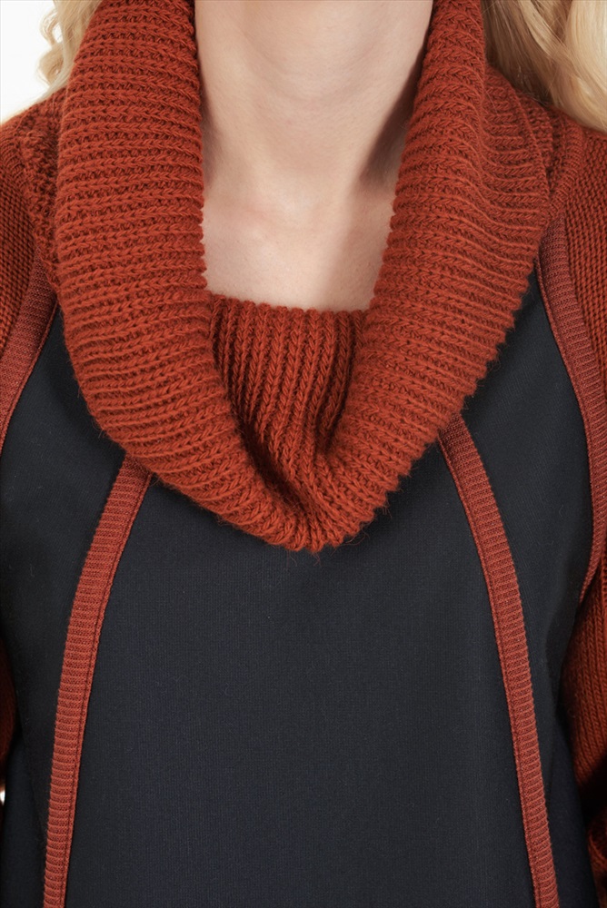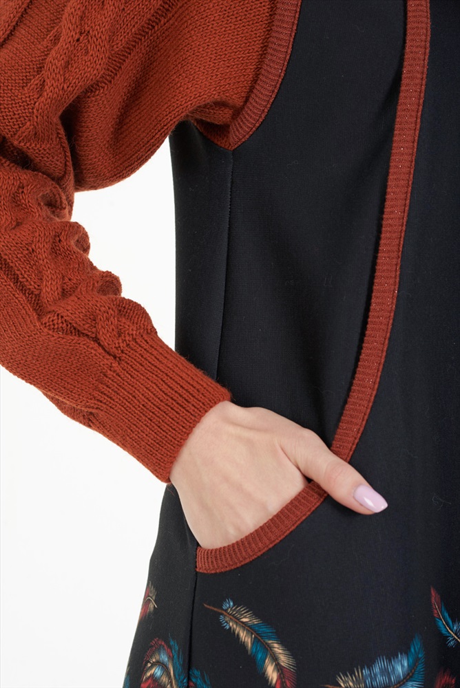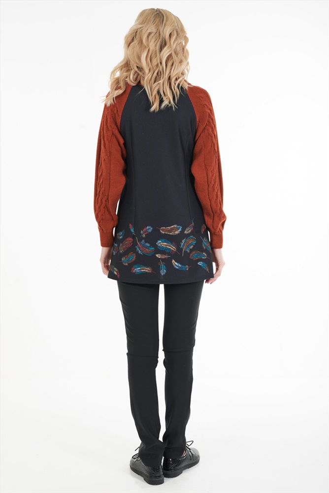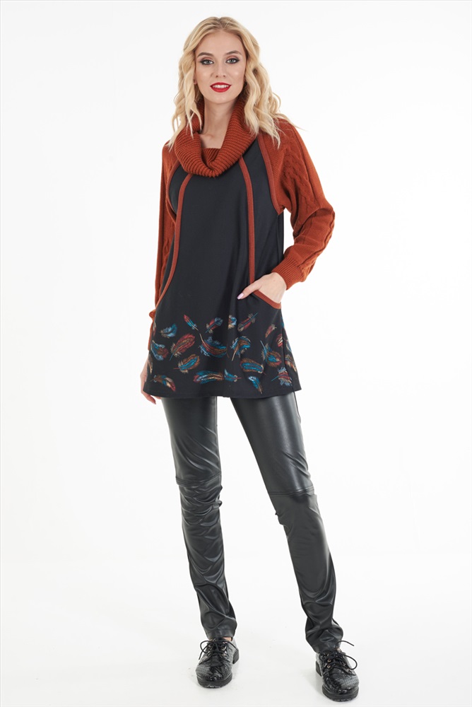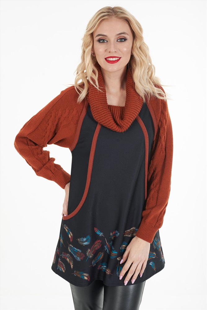 Уютный джемпер-туника полуприлегающего силуэта из трикотажного полотна с купонным рисунком. Воротник хомут и втачные рукава выполнены в технике ручного вязания из натуральных нитей. По переду изделия выполнены канты. Джемпер-туника дополнена накладными карманами. Длина изделия по спинке от плечевого шва до низа изделия — 72 см. Рост модели - 170 см.