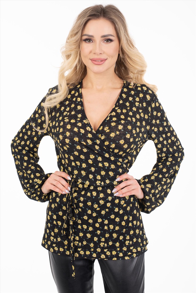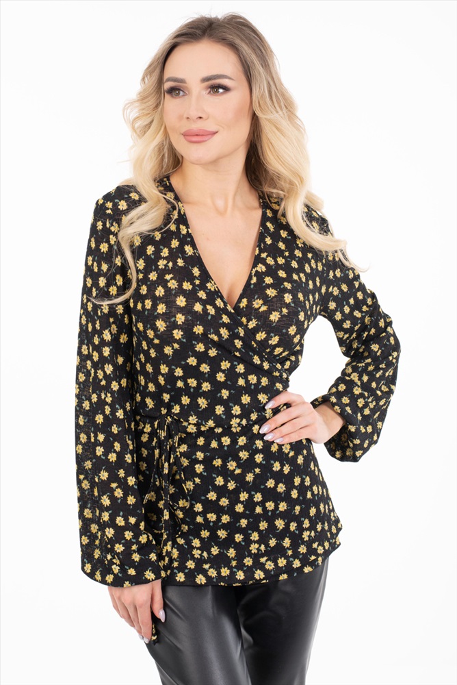 Женственный джемпер полуприлегающего силуэта из трикотажного полотна черно-желтого цвета. По переду изделия выполнен запах. Широкие втачные рукава обработаны окантовкой. Джемпер дополнен поясом. Длина изделия по спинке от плечевого шва до низа изделия - 64 см. Рост фотомодели — 170 см.