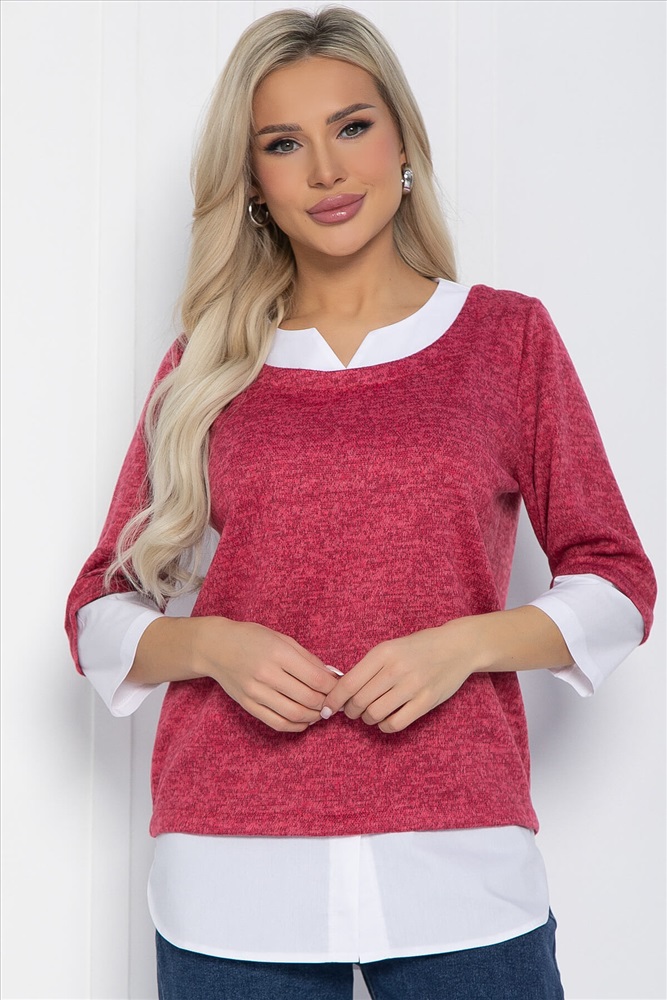 Тип ткани: смесовая. Состав: 65% полиэстер, 30% вискоза, 5% эластан. Материал: трикотаж и хлопок-стрейч компаньон. Цвет: коралловый. Принт: отсутствует. Вид застежки: без застёжки. Силуэт: прямой. Карманы: отсутствуют. Подкладка: отсутствует. Декоративные элементы: отсутствуют. Длина по спинке от верхней точки плеча: 46-48/ 71 см, 50-52/ 72 см, 54-56/ 73 см. Размер изделия на модели: 44 Рост модели: 168 см. Джемпер из мягкого трикотажа украсит ваш деловой образ и сделает его красивым и комфортным. Сочетание двух видов ткани создаёт эффект многослойного образа. Уход за изделием: ручная стирка до 30 градусов; нельзя отбеливать; отжим запрещён; гладить при t не более 110 С; гладить с изнанки. Внимание! Рекомендуем ориентироваться на размерную сетку и выбирать свой привычный размер, согласно размерной таблице. *Допуск отклонения длины при массовом производстве 1-3 см является нормой. Комментарии к товару