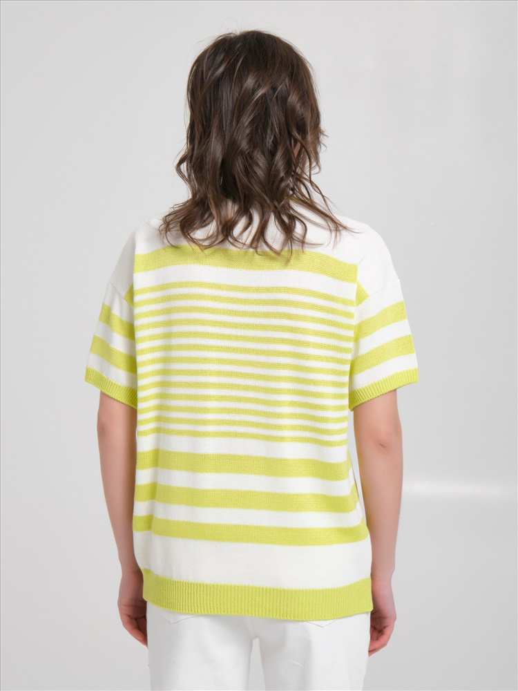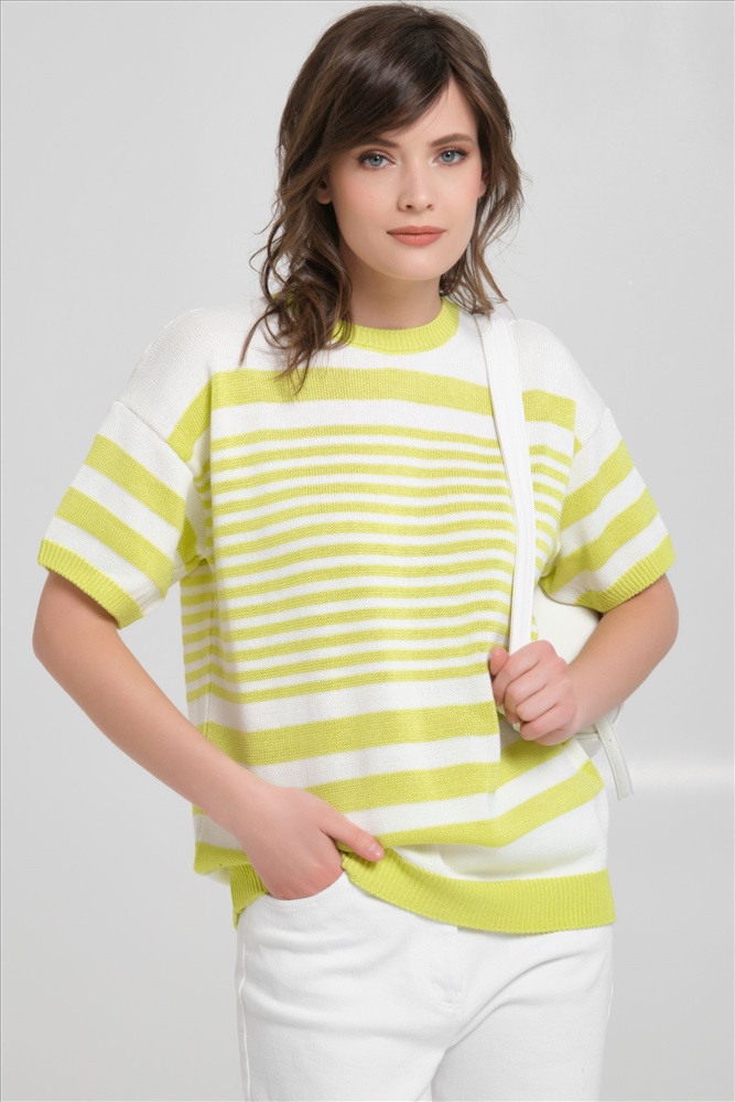 Джемпер вязаный в полоску от фабрики Priz. Модель прямого силуэта, круглый вырез горловины. Короткие рукава. Комфорт и стиль на каждый день., Оттенок цвета и расположение рисунка могут незначительно отличаться от фото., Ожидание отправки (рабочих дней): 7, Размер модели: 44., Рост модели: 174 см., Состав:, Акрил 40%, Хлопок 30%, Вискоза 30%, Тип ткани:, Вязаный трикотаж