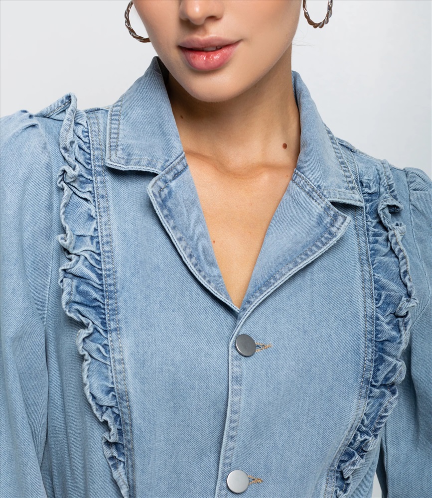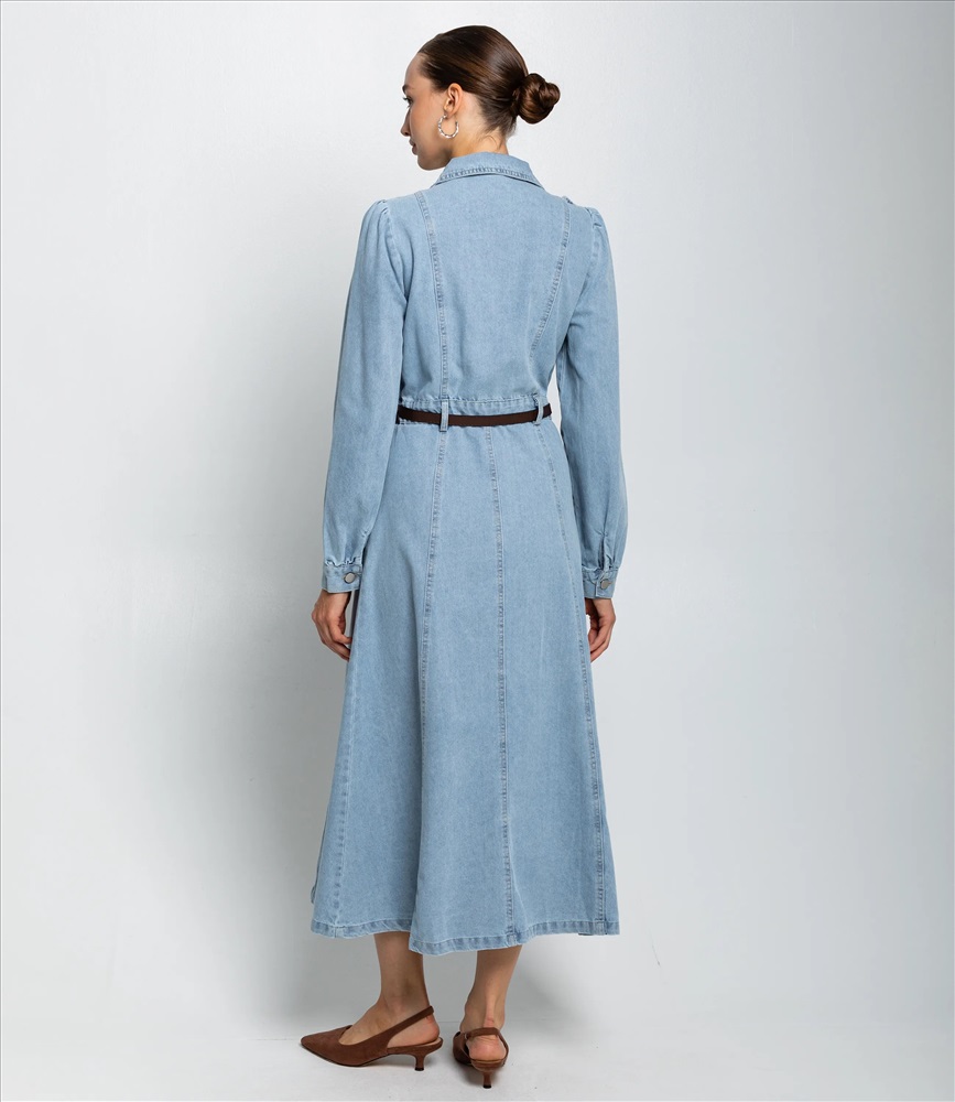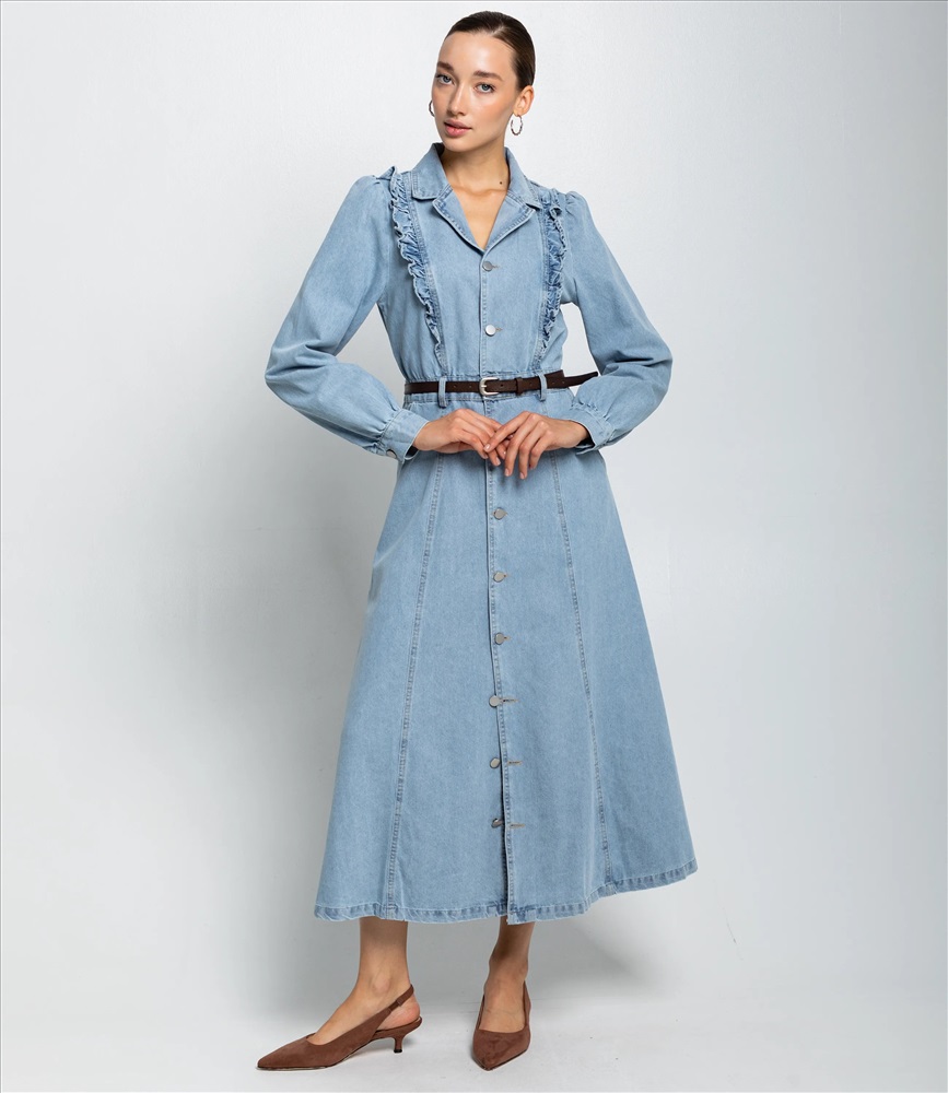Платье – это вещь, которая подчеркивает женственность каждой представительницы прекрасного пола. Данная модель платья с коротким рукавом отлично подойдет для летнего сезона. Платье длиной макси‑миди до щиколоток с приталенным силуэтом и лёгким расклёшенным подолом, застёгивается по всей длине на ряд крупных пуговиц. Отложной воротник с небольшим лацканом, образует V‑образный вырез при расстёгнутых верхних пуговицах. Длинные слегка объёмные рукава с небольшим сбором в плечевой зоне, манжеты на пуговице, аккуратная длина до запястья. Вертикальные швы и рельефы от плеч к талии создают приталивание; тонкий ремень подчёркивает талию и добавляет структурности силуэту. Декоративные рюши вдоль передних рельефных швов у груди, видимая строчка по швам, функциональные наклонные карманы в боковых швах на уровне бёдер. Плавно расширяющийся подол со свободной посадкой для удобства движений. Для изготовления использована ткань 100% хлопок, которая характеризуется отличным качеством. Даже после многих стирок платье не потеряет изначальной красоты. Вы обязательно будете его носить с удовольствием. Обратите внимание на цвет джинсового платья. Он является насыщенным и полностью соответствует фото на сайте. Чтобы вы были уверены в размере, мы предоставили на сайте таблицу. Воспользовавшись ею, вы сможете самостоятельно обмерить себя и удостовериться. Установленная нами цена является приемлемой. Не откажите себе в удовольствии быть неповторимой! Рост 168 см, 85-63-92. Вы можете заказать онлайн презентацию на интересующие Вас модели. Наши менеджеры свяжутся с Вами и проведут индивидуальную видеотрансляцию, помогут составить заказ и ответят на Ваши вопросы.