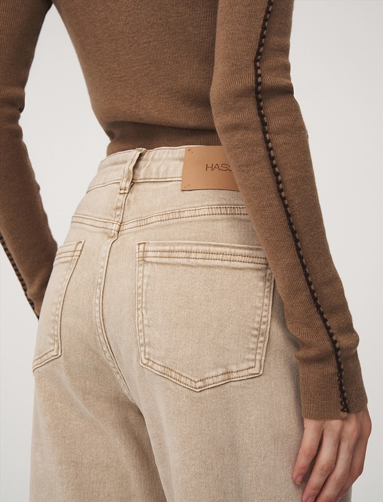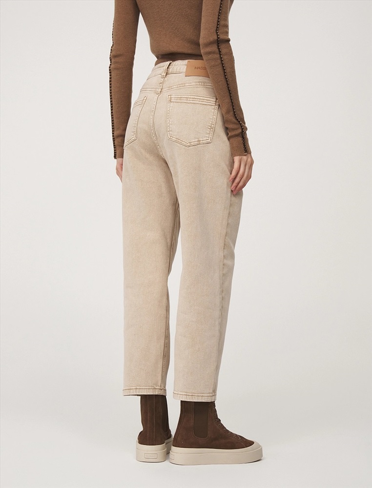 Джинсы зауженного к низу силуэта с посадкой на талии, укороченные. Деликатная варка придает состаренный эффект. По передней части изделия карманы и гульфик с застежкой на молнию и пуговицу. Сзади кокетка, накладные карманы и брендированный патч HASS. По поясу расположены шлевки. Ткань выполнена из хлопка с добавлением полиэс-тера и спандекса, что продлевает срок эксплуатации изделия и обеспечивает удобство в носке.