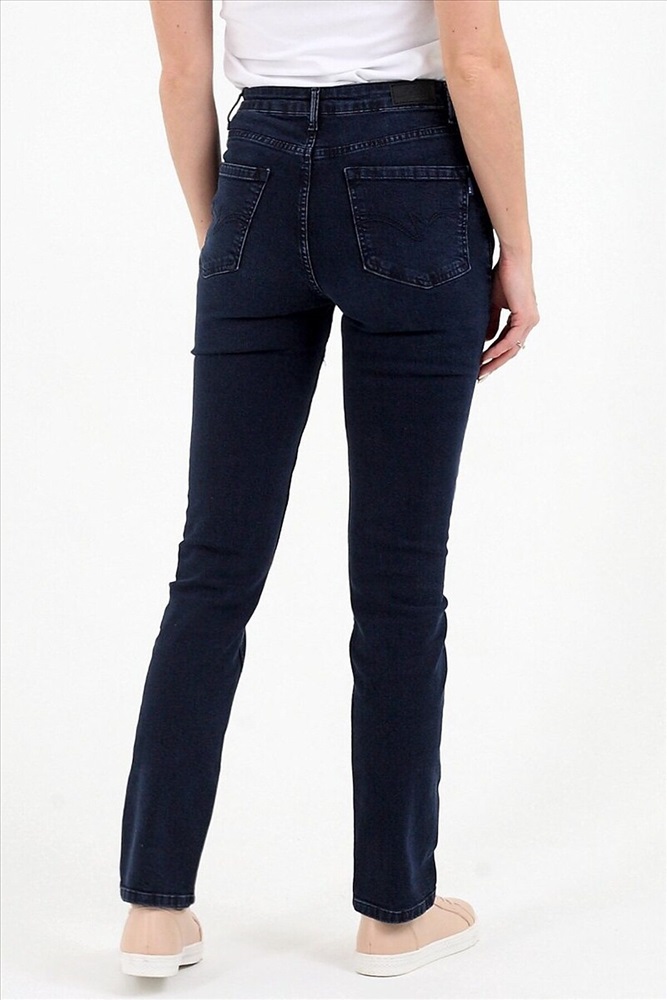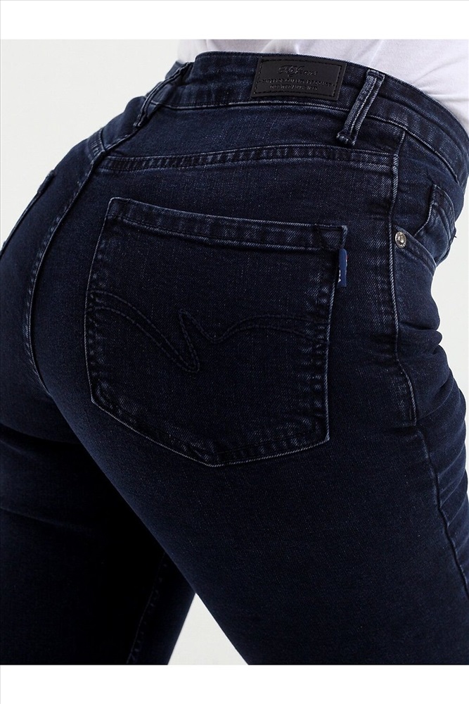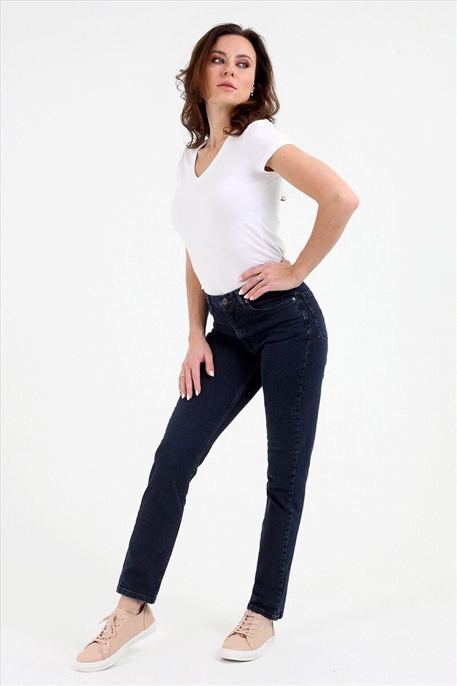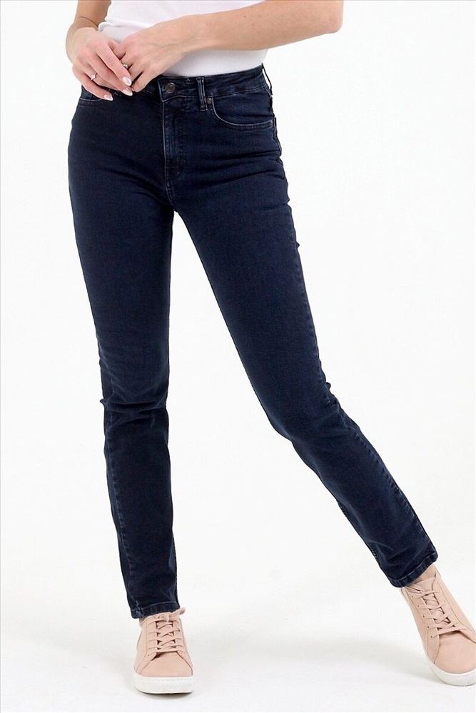 Женские классические джинсы с пятью карманами. Посадка Regular fit (полуоблегающие по бедру). Специально завышенная талия. Для улучшения посадки по талии сделан подкройной пояс из 2-х частей. Застежка на молнии. Узкие по низу. Выполнены из слабоэластичной ткани denim comfort stretch, цвет ткани Blue/Black (лицевая сторона ткани темно-синяя, изнаночная сторона черная). Темная стирка с потёртостями только по швам. Параметры указаны для размера 28. Длина внутреннего шва - 78, 0 см.