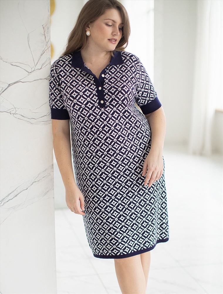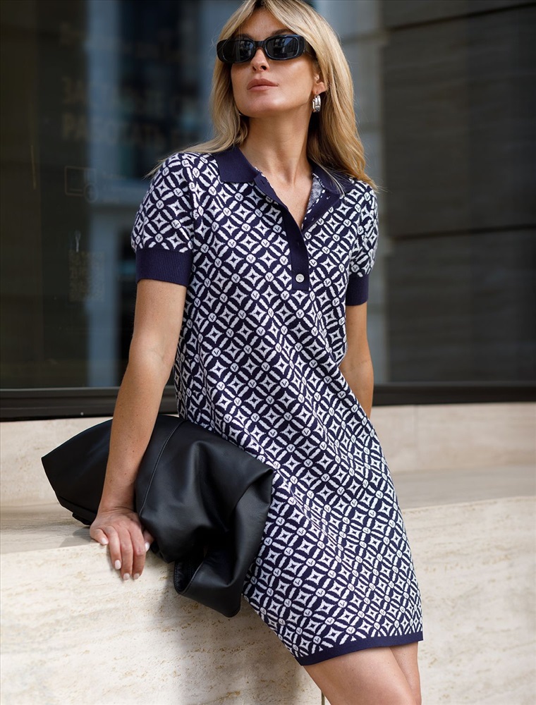 Платье длины мини с воротником поло выполнено из мягкого трикотажа на основе шелковистой эластичной вискозы. Жаккардовое переплетение образует геометрический узор. Застежка на перламутровые пуговицы подчеркивает гладкость пряжи. Контрастный воротник и манжеты делают узор еще более выразительным. Можно сочетать с жакетом D31.388 из жаккардовой коллекции.