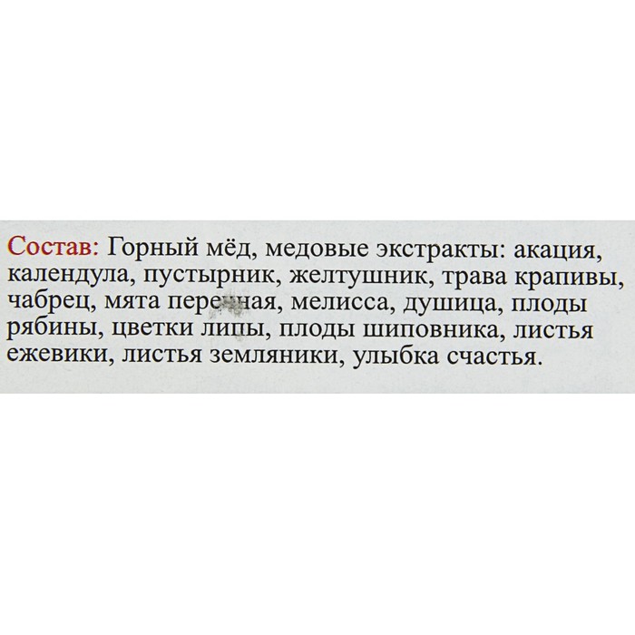 Состав: горный мёд, медовые экстракты: акация, календула, пустырник, желтушник, трава крапивы, чабрец, мята перечная, мелисса, душица, плоды рябины, цветки липы, плоды шиповника, листья ежевики, листья земляники.