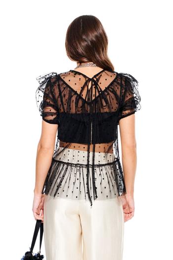 Блузка из различных материалов. Верхний слой блузки из сетчатого материала в горошек, полуприлегающего силуэта, с круглым вырезом горловины. Детали полочки и спинки с горизонтальным подрезом и отрезной фигурной кокеткой с воланом. Нижние части полочек и спинки собраны на сборку. Спинка с завязками на горловине. Кокетка спинки с средним швом и разрезом. Рукав втачной, короткий, со сборкой на резинку по нижнему срезу. Нижняя блузка из струящейся ткани с блеском, прилегающего силуэта, на тонких регулируемых бретелях, на подкладке. Лиф переда с рельефами и отрезными чашками. Спинка с рельефами, с центральной застежкой на тесьму-молнию.