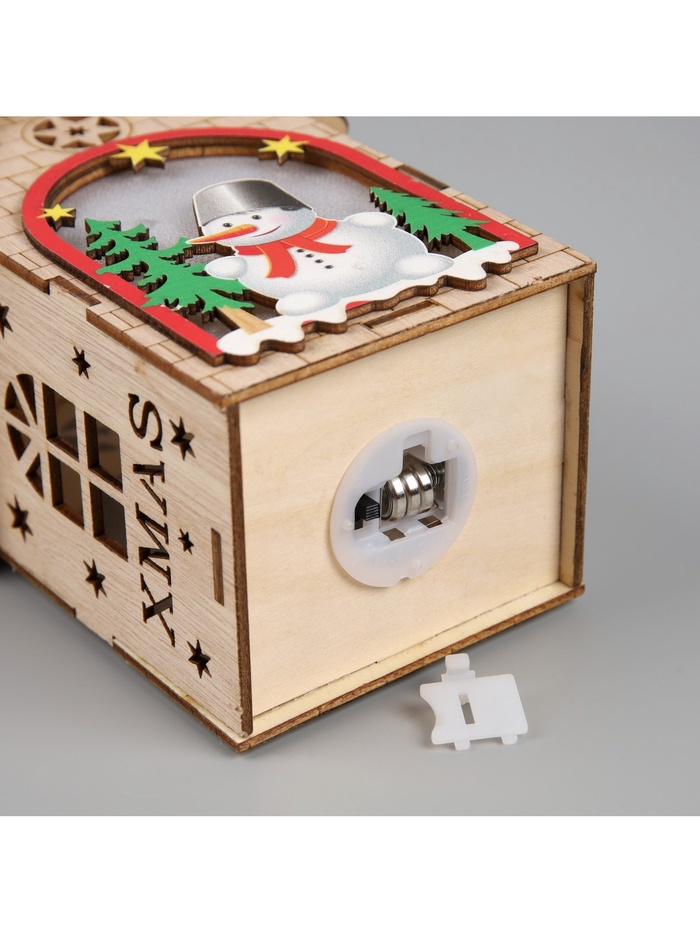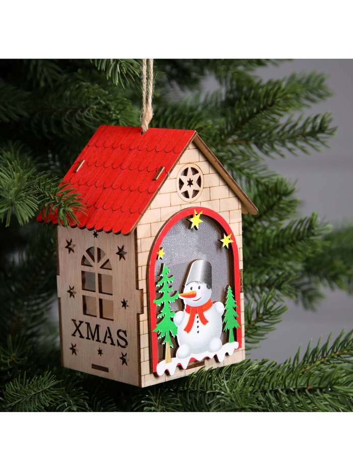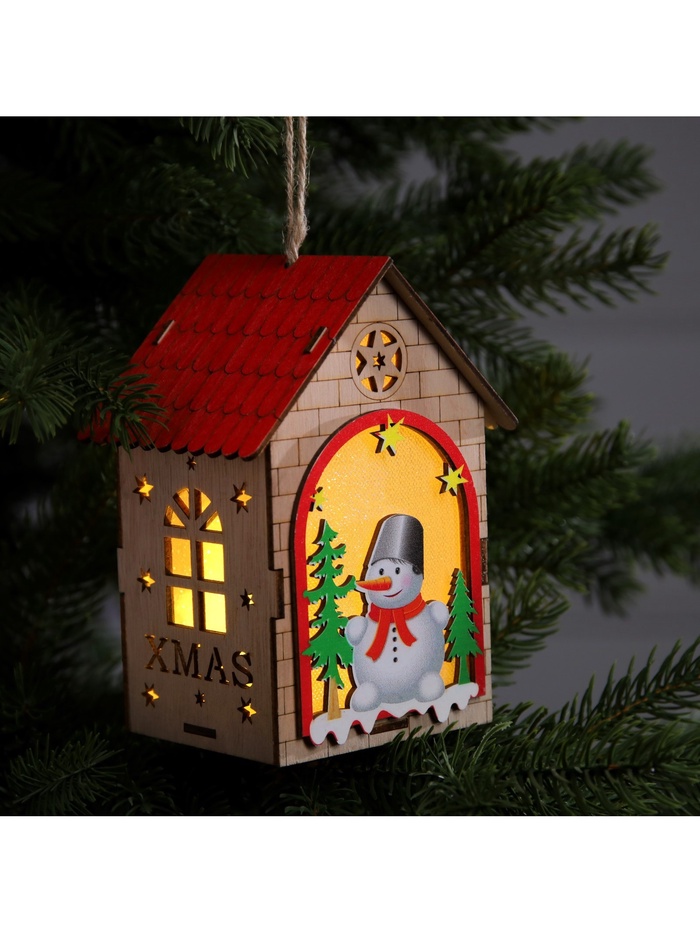 Изготовленный из дерева, домик освещает пространство тёплым белым сиянием, создавая уютную и праздничную атмосферу. Благодаря встроенному светодиоду, работающему от батареек, игрушка может быть размещена в любом месте, будь то ветки ёлки или полки в вашем доме. Его размеры 14.5х11х8.5 см делают его удобным для размещения и достаточно заметным.