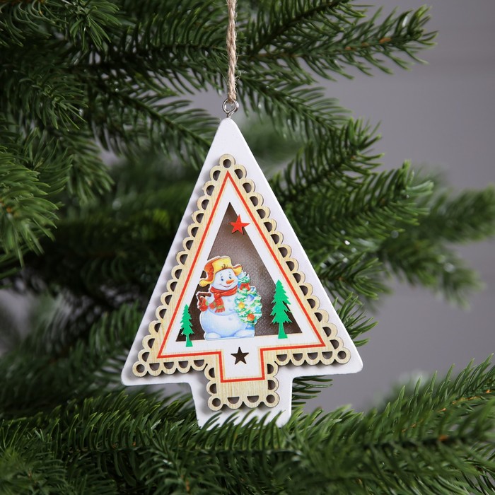 Изготовленное из натурального дерева, ёлочное украшение освещает пространство тёплым белым сиянием, создавая атмосферу уюта и волшебства. Встроенный светодиод, работающий от батареек, позволяет разместить игрушку в любом месте — будь то ветки ёлки или полки в вашем доме. Компактные размеры 11x2.5x9.5 см делают его удобным для размещения и достаточно заметным.