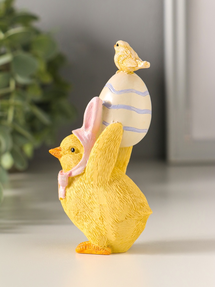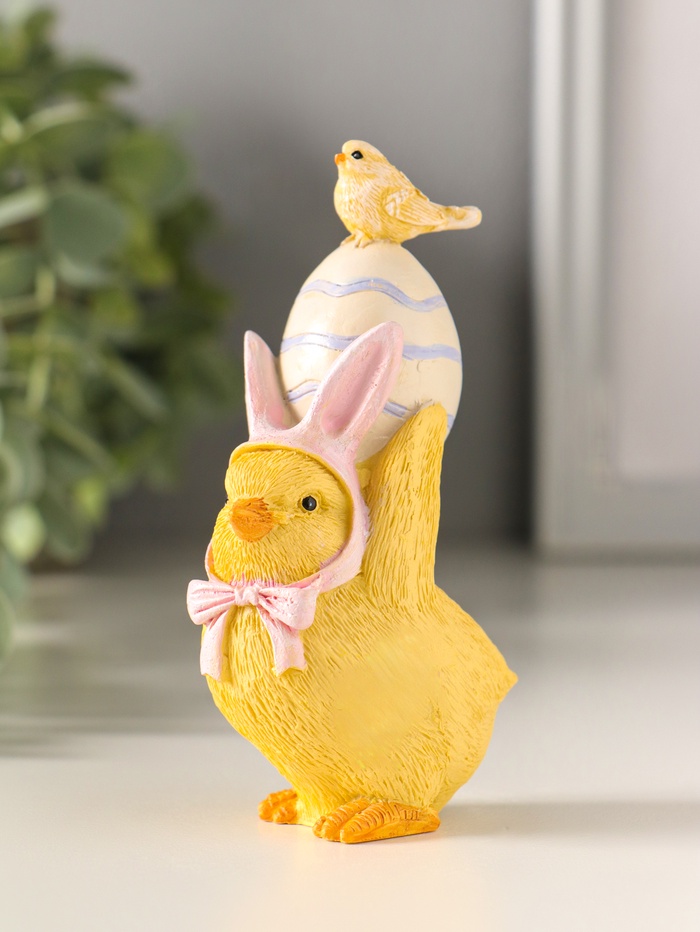 Этот пасхальный цыплёнок в розовой шапочке — милый хранитель праздничного настроения. Фигурка из полистоуна с тёплым жёлтым окрасом и яркими деталями станет душевным дополнением к вашему весеннему декору. Поставьте его на полку или праздничный стол, чтобы создать атмосферу уюта и радости.