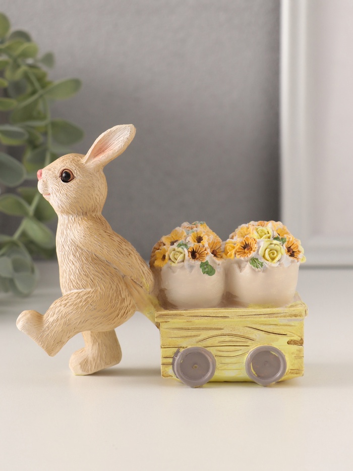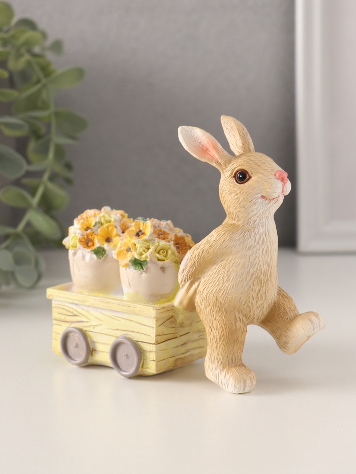 Добавьте нотку уюта и весеннего настроения в ваш интерьер с этой очаровательной фигуркой. Зайчик, везущий цветочные горшки на тележке, станет символом заботы и трудолюбия, а его яркий, разноцветный дизайн привлечёт внимание и создаст атмосферу радости. Компактные размеры (11×4×10 см) позволяют легко разместить фигурку на полке, столе или в составе декоративной композиции.