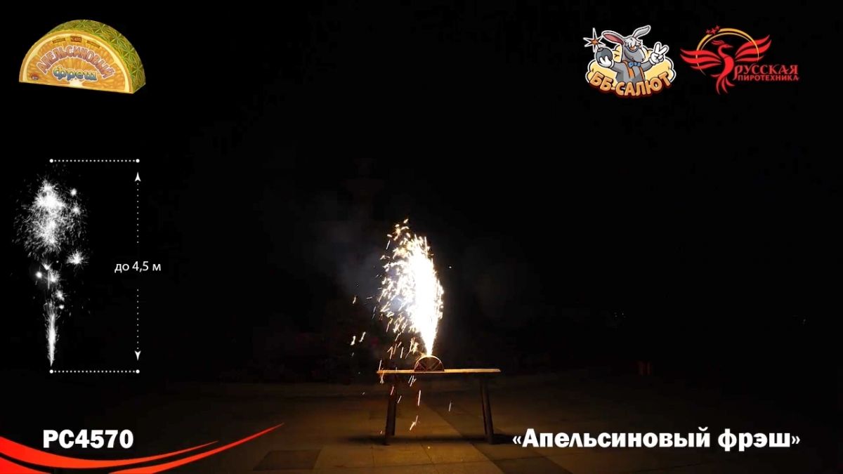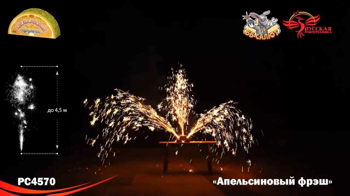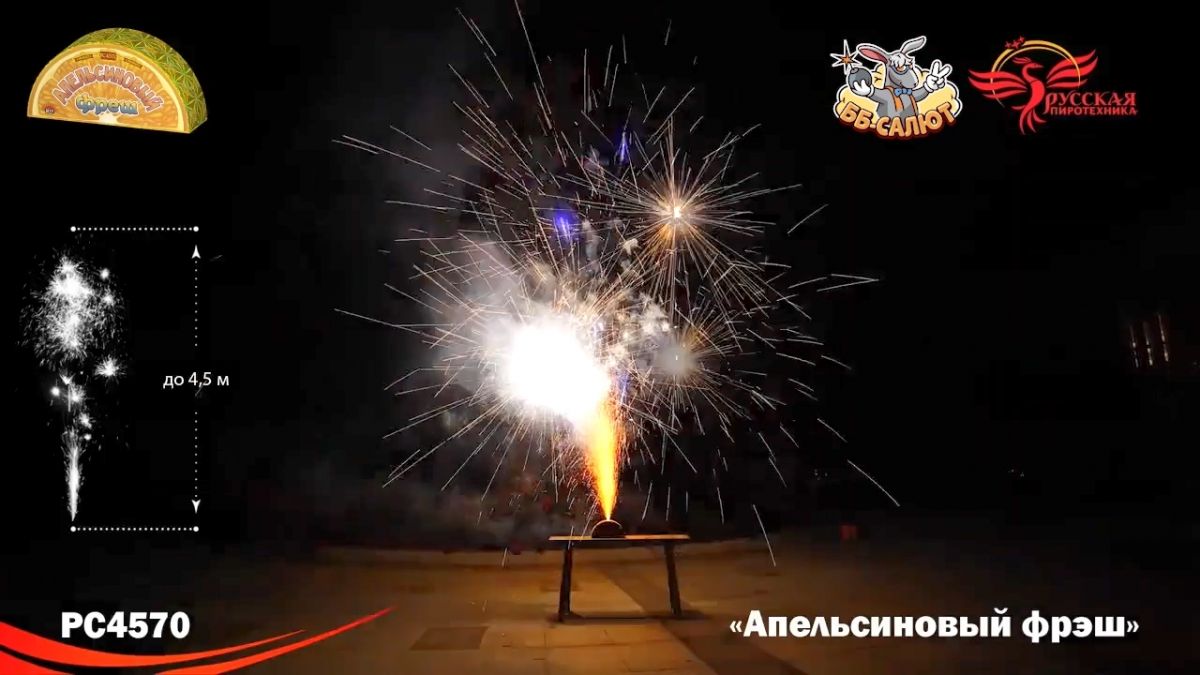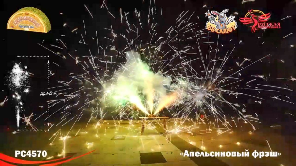 1. Поток ниспадающих золотых искр и серебряных искр в центре. 2. Поток золотых искр у основания, крупных трещащих серебряных искр и синих огней. 3. Веер: 3 потока золотых ниспадающих звёздочек. 4. Веер: 3 потока крупных серебряных и зелёных огней.