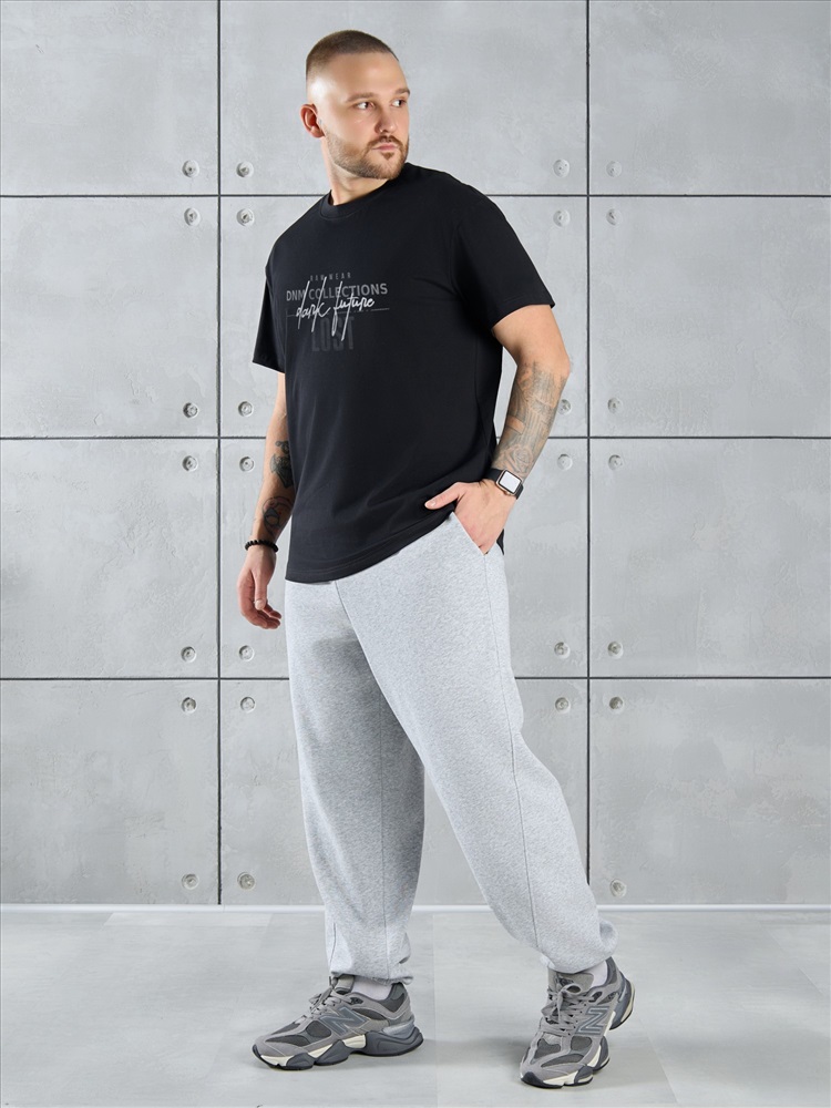 Футболка мужская из гладкокрашеного трикотажного полотна "кулирка с лайкрой" классического покроя со слегка удлиненными плечевыми швами, короткими втачными рукавами, и горловиной овальной формы, обработанной втачной планкой. На детали переда - принт, выполненный в технике шелкографии. По горловине настрочена двойная отделочная строчка. Низ рукавов и изделия обработаны подгибкой.