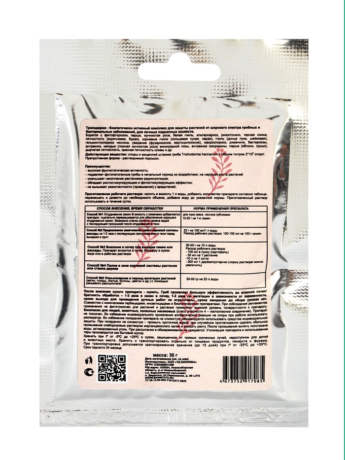 Производитель: Бионика; Габариты: 15 x 10 x 0,3; Страна: Россия; В боксе: 50 шт; Состав: См. на упаковке; Материалы: см. на упаковке; Фасовка: по 1 шт; Сертификат: Не подлежит сертификации; Область применения: От бактериальных и грибных болезней; Препаративная форма: Порошок; Вид: БИОпрепараты; Вес/Объём: 30 г; Способ нанесения: Протравливание (замачивание клубней, луковиц), Опрыскивание, Полив; Действующие вещества: Споры грибов Trichoderma; Тип пестицида: Контактный