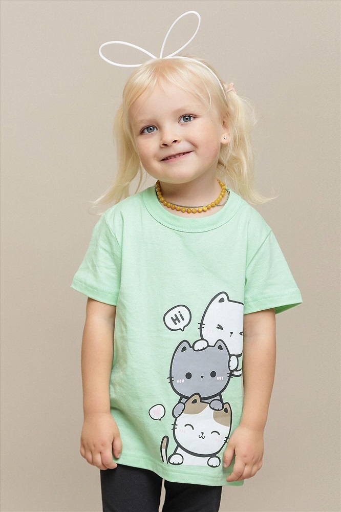 ID товара: 1049901 Состав: 100% Хлопок Сезон: Демисезон Длина: Средняя Фасон: Прямой Рукав: короткие Вырез горловины: Округлый Рисунок: котики Декоративные элементы: Принт Основная ткань: Хлопок Стиль: повседневный Страна бренда: Россия Страна производства: Россия Футболка с коротким рукавом для девочки в салатовой расцветке с принтом в виде котят. Повседневная детская футболка для детей от 2 до 8 лет идеально подходит для похода в садик, школу, для занятий физкультурой и спорта, а также в качестве универсальной домашней или пляжной одежды. Футболка для девочек изготовлена из натурального хлопка, обеспечивает комфорт и удобство. Характеристики: