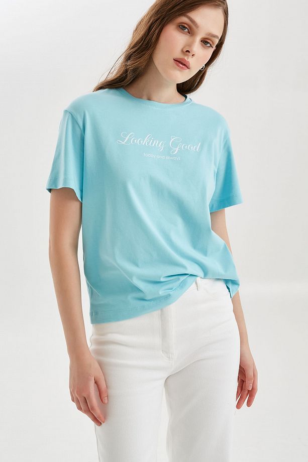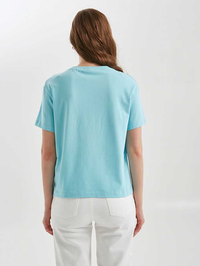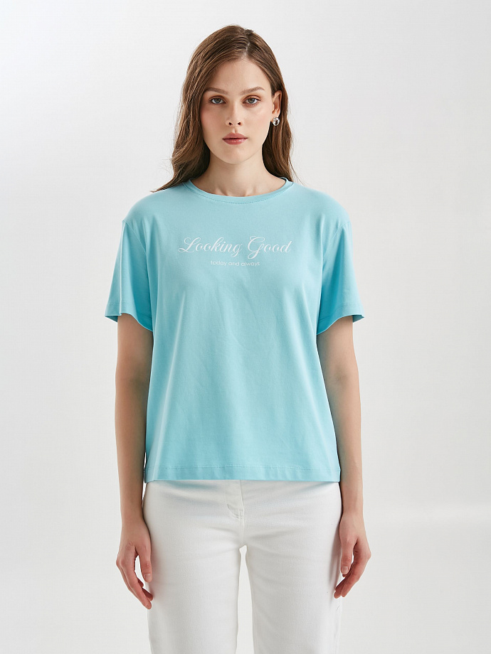 Футболка голубая с принтом от фабрики Priz. Модель прямого кроя, выполнена из трикотажа. Рукав втачной, короткий. Плечо спущенное. Горловина обработана бейкой. Комфорт и стиль на каждый день., Оттенок цвета и расположение рисунка могут незначительно отличаться от фото., Ожидание отправки (рабочих дней): 7, Длина: в 42 р-ре - 60 см, в 54 р-ре - 62 см., Размер модели: 44., Рост модели: 164 см., Состав:, Хлопок 97%, Эластан 3%, Тип ткани:, Трикотаж
