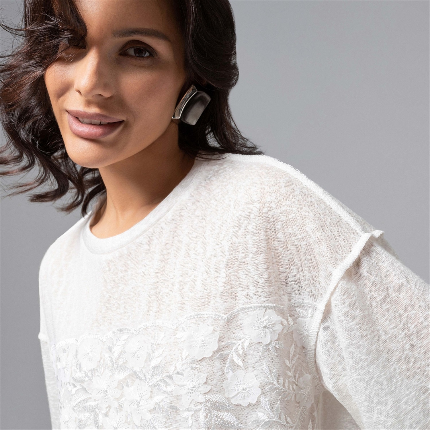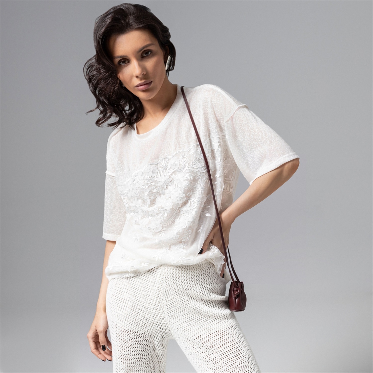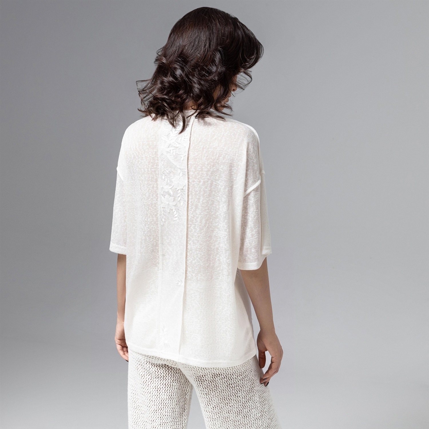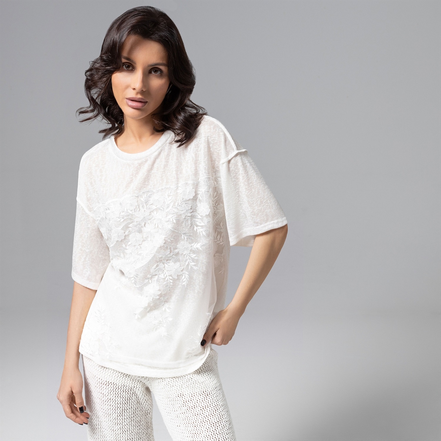 Нежность в максимальной концентрации. Футболка из мягкой вискозы в сочетании с вышивкой и объемным декором создана, чтобы сделать ваш выход из дома наполненным красотой и элегантностью. Футболка удлиненная из мягкого материала. Спущена линия плеча. Вышивка на сетке вторым слоем. Акцентные швы наружу. Комментарии к товару