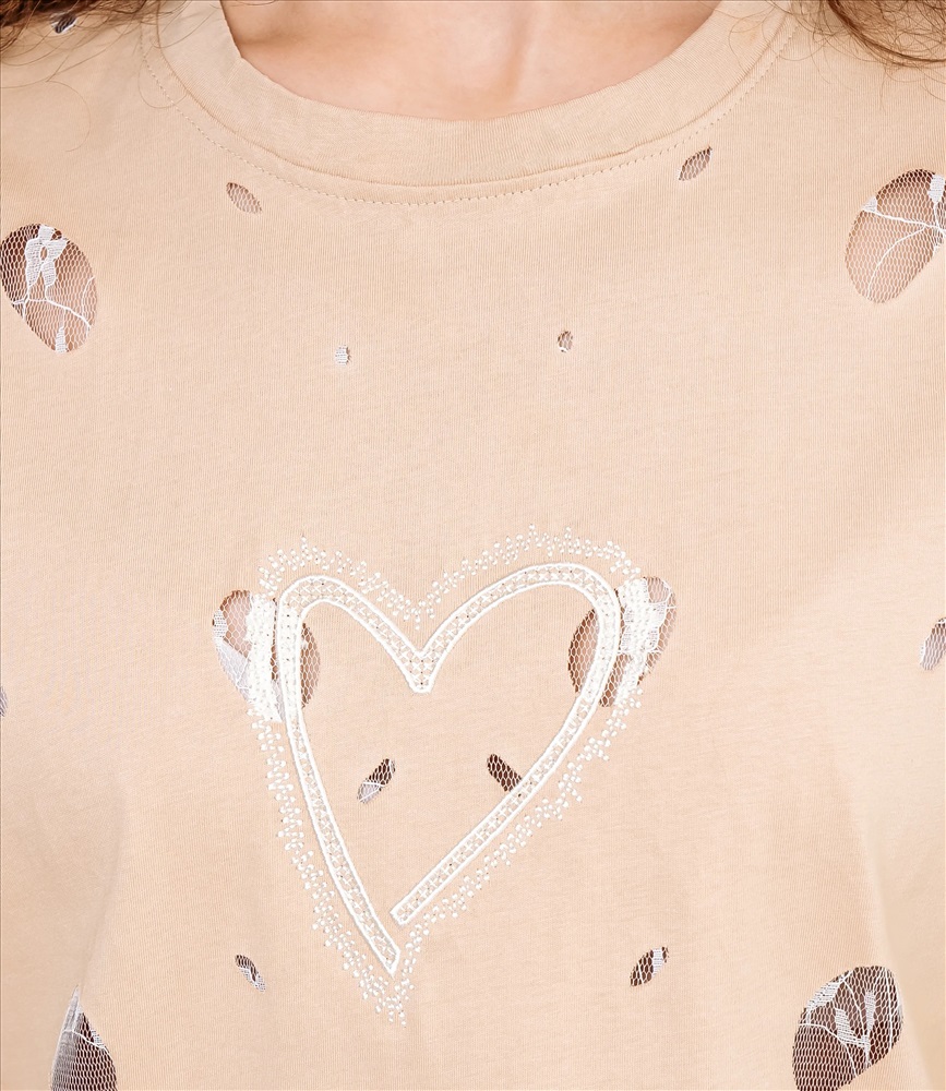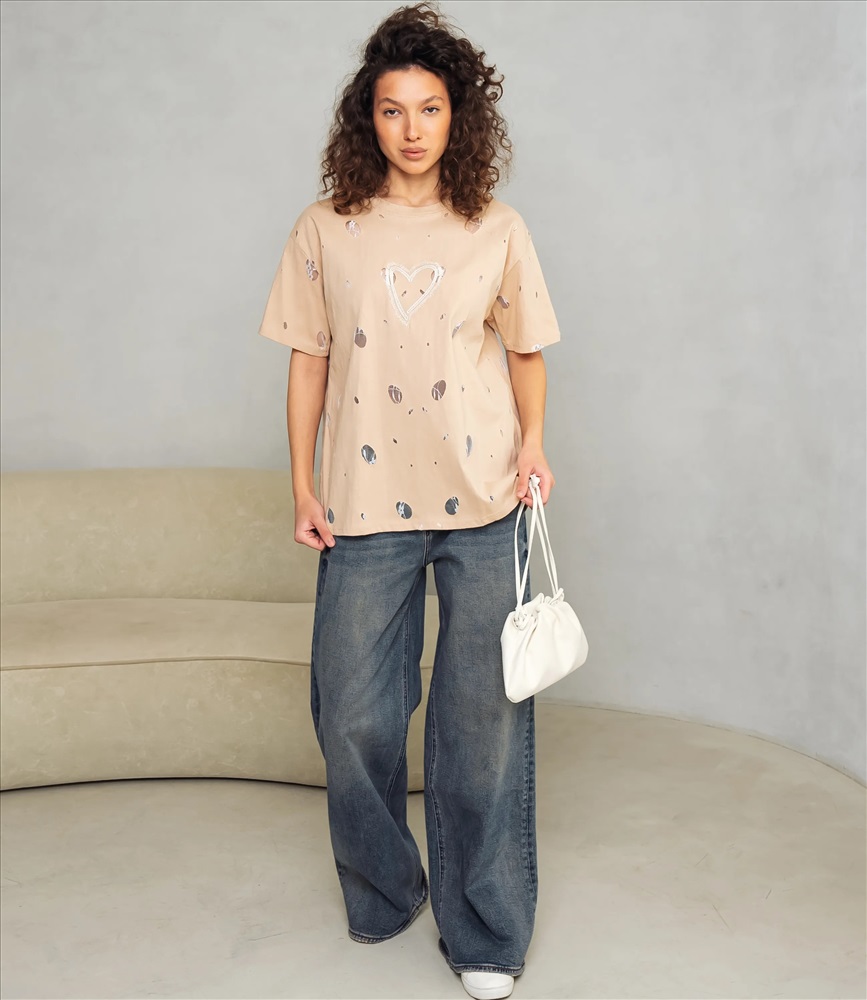 Футболка – это одежда, которая подчеркивает женственность каждой представительницы прекрасного пола. Футболка свободного кроя с классическим круглым вырезом горловины; короткие рукава средней длины, немного расширенные и с подшитым краем, не прилегают плотно к руке; длина корпуса доходящая до верхней части бёдер, прямой низ с подогнутым и простроченным подолом; поверхность украшена разбросанными мелкими абстрактными пятнами разной формы и центральным графическим мотивом в виде условного сердца на груди. Для изготовления использована ткань 65% хлопка и 35% полиэстер, которая характеризуется отличным качеством. Даже после большого количества стирок изделие не утратит первоначальной привлекательности. Вы будете носить его с радостью. Обратите внимание на цвет. Он является насыщенным и полностью соответствует фотографии на сайте. Чтобы вы были уверены в размере, мы представили на странице таблицу. Воспользовавшись ею, вы сможете сами обмерить себя и удостовериться. Установленная нами цена является доступной. Не откажите себе в удовольствии быть элегантной!
