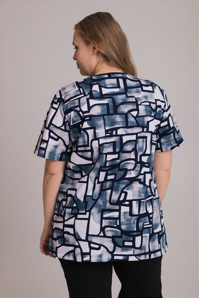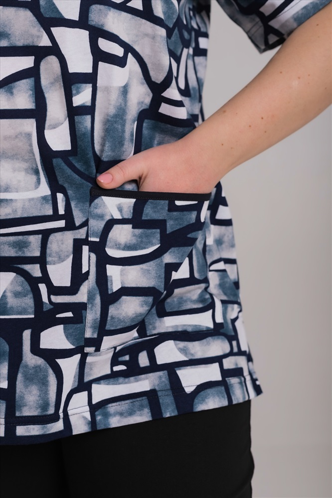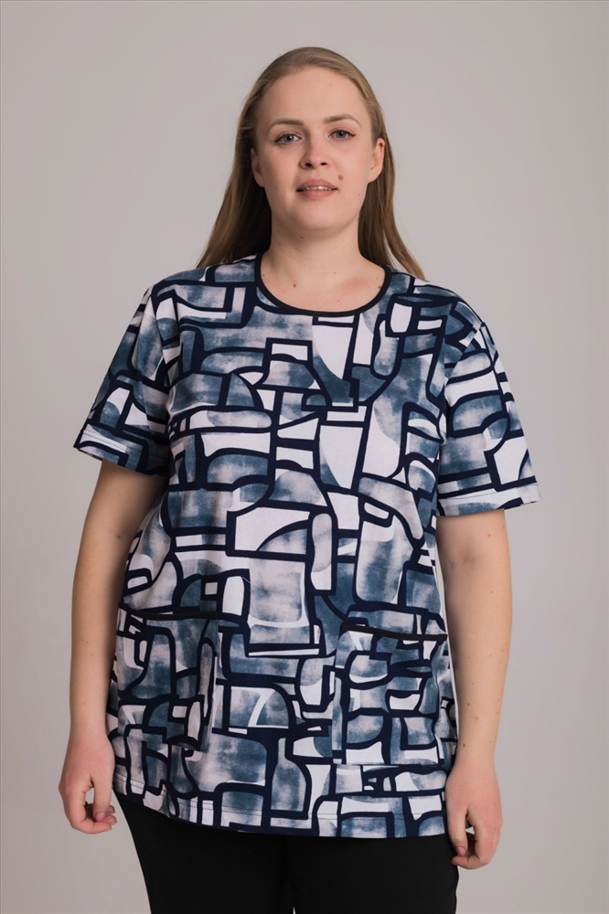 Сезон: Всесезонный Силуэт: Прямой Состав: Хлопок 100% Цвет Номенклатуры: синий/белый Лаконичная и комфортная футболка из мягкой кулирки — приятная к телу, дышащая и удобная для ежедневной носки. Круглый вырез горловины оформлен аккуратной окантовкой, короткий рукав обеспечивает свободу движений. По бокам расположены практичные накладные карманы с контрастной отделкой, добавляющей модели выразительности. Рисунок на полотне создаёт современный, динамичный образ. Прямой свободный силуэт и оптимальная длина делают эту футболку универсальной и функциональной в любом гардеробе. Комментарии к товару