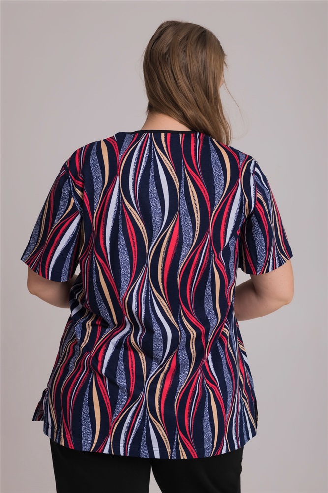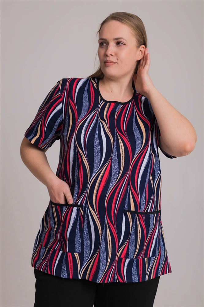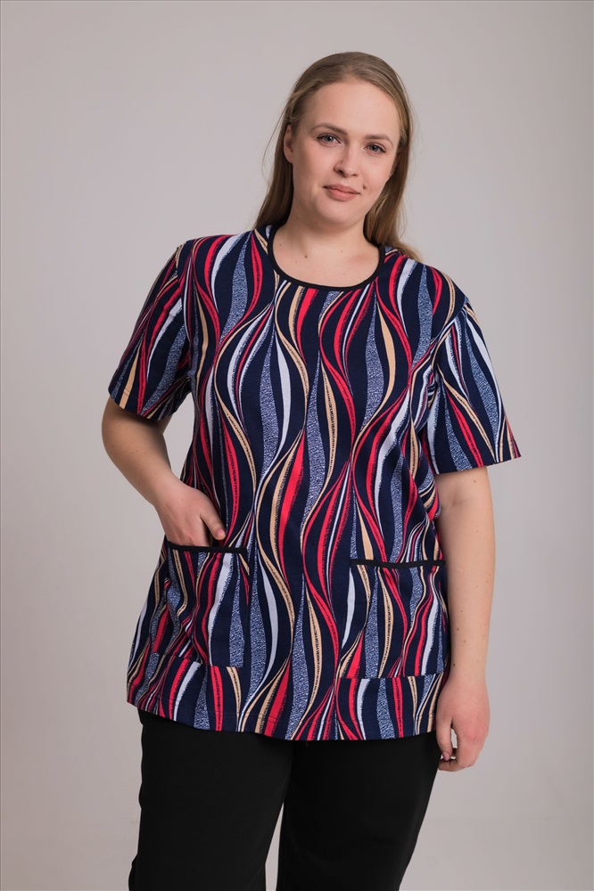 Сезон: Всесезонный Силуэт: Прямой Состав: Хлопок 100% Цвет Номенклатуры: синий/красный Лаконичная и комфортная футболка из мягкой кулирки — приятная к телу, дышащая и удобная для ежедневной носки. Круглый вырез горловины оформлен аккуратной окантовкой, короткий рукав обеспечивает свободу движений. По бокам расположены практичные накладные карманы с контрастной отделкой, добавляющей модели выразительности. Рисунок на полотне создаёт современный, динамичный образ. Прямой свободный силуэт и оптимальная длина делают эту футболку универсальной и функциональной в любом гардеробе. Комментарии к товару