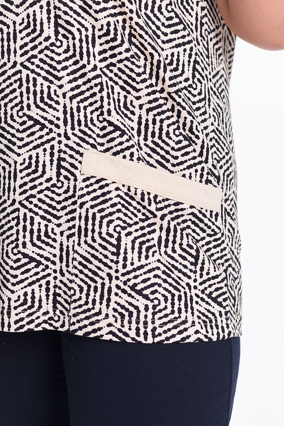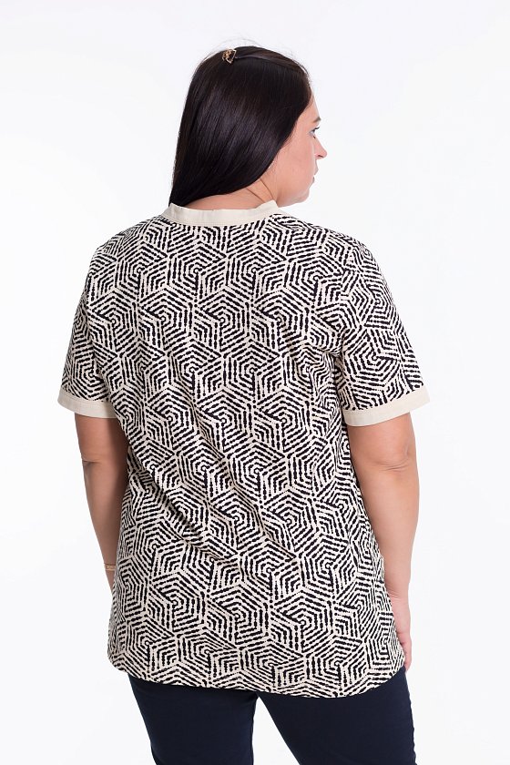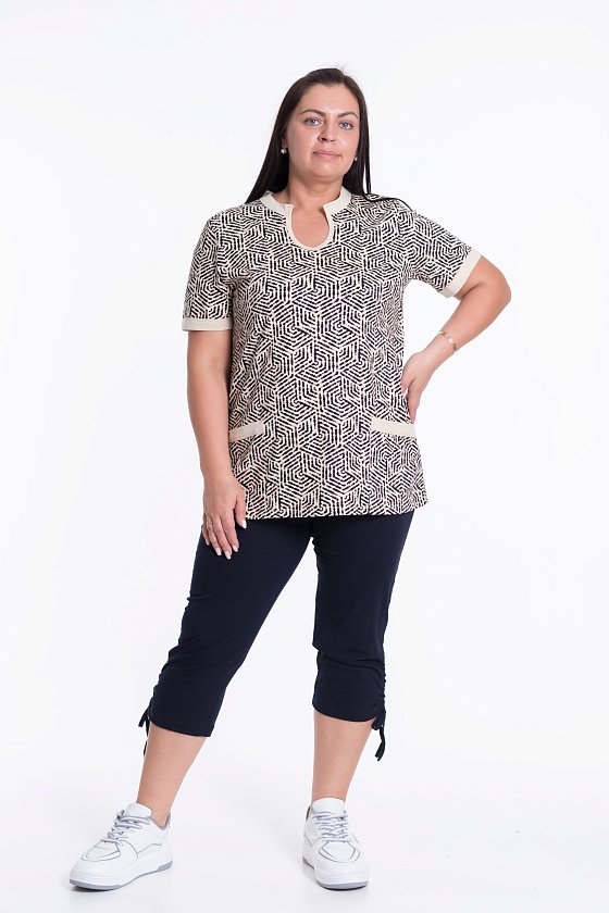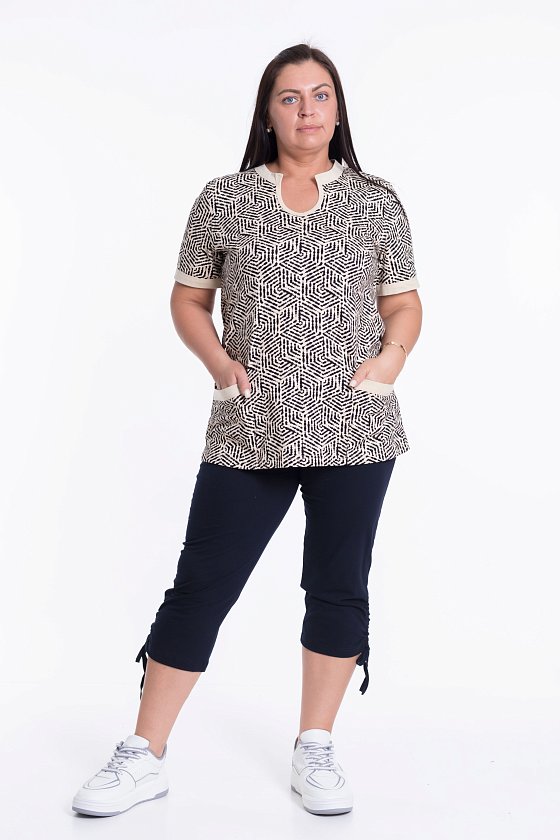Женская футболка выполнена из кулирки, 100% хлопок. Вырез горловины фигурный, низ рукавов и карманы с контрастной отделкой.