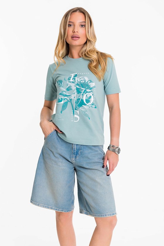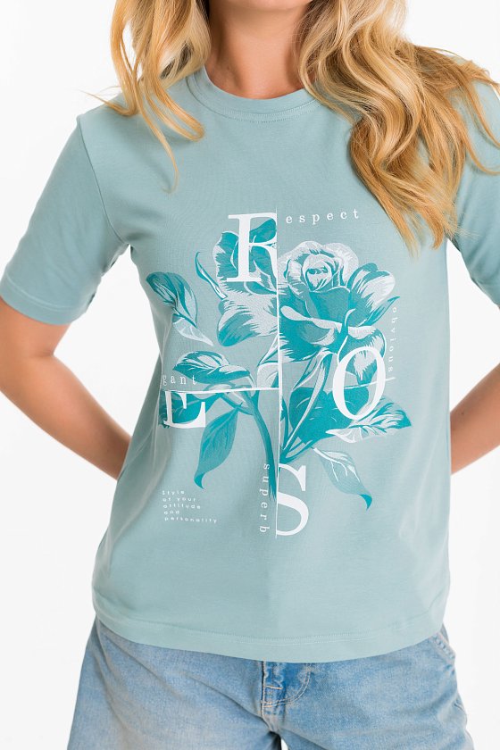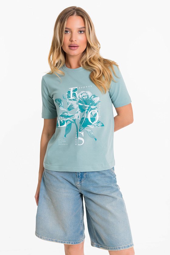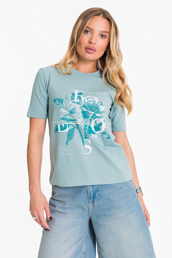 Однотонная футболка из кулирки с лайкрой. Короткий рукав, притачная планка по горловине, на полочке принт.
