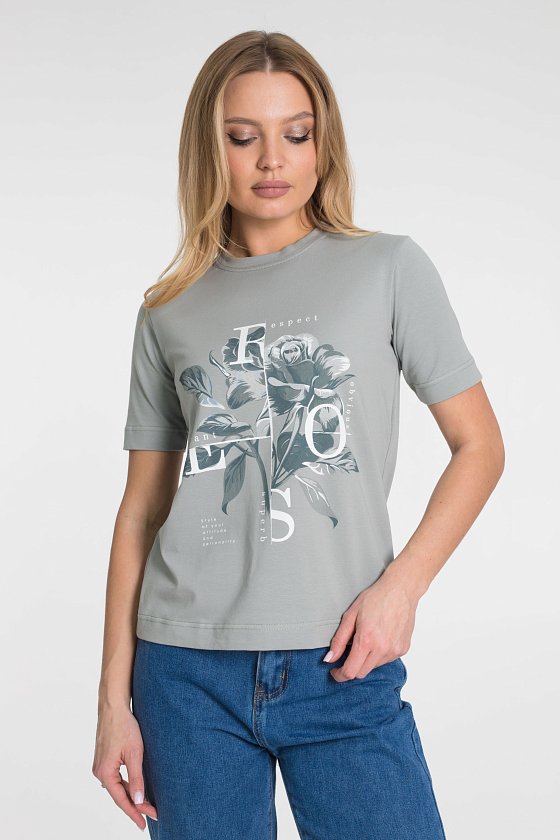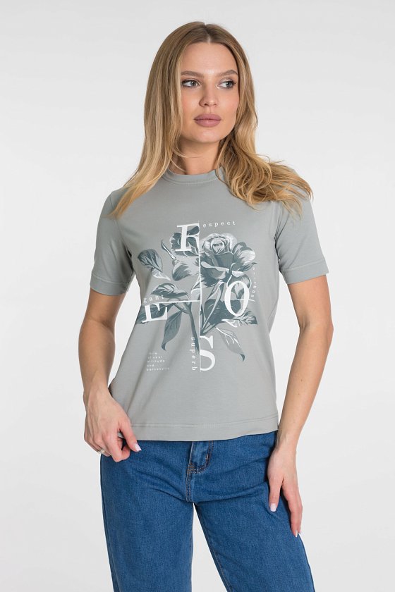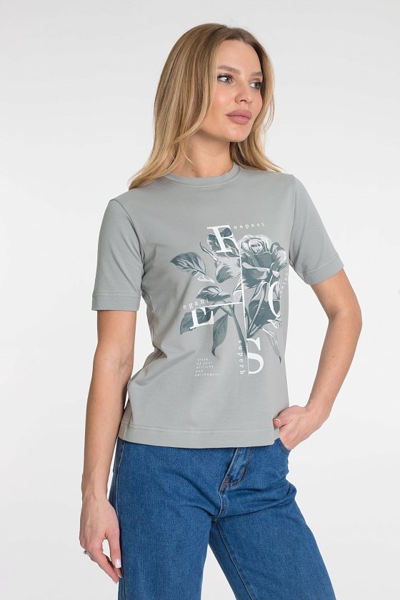 Короткий рукав, притачная планка по горловине, на полочке принт.