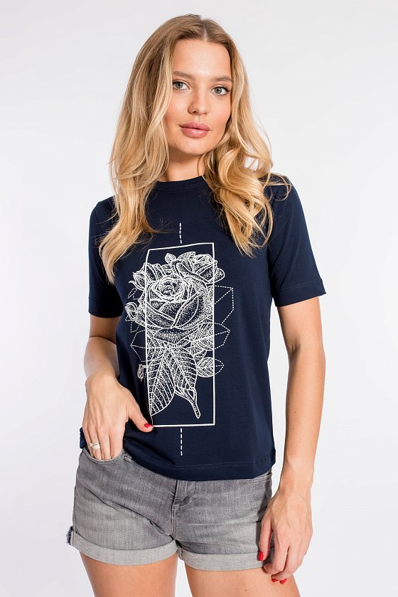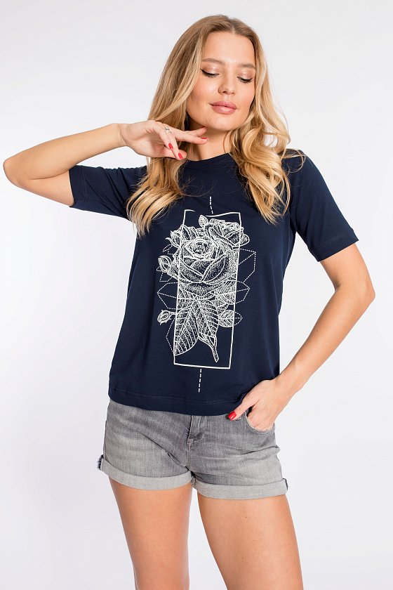 Футболка из кулирки с лайкрой с коротким втачным рукавом. Силуэт полуприлегающий, круглый вырез горловины оформлен притачной планкой. Спереди нанесён принт.