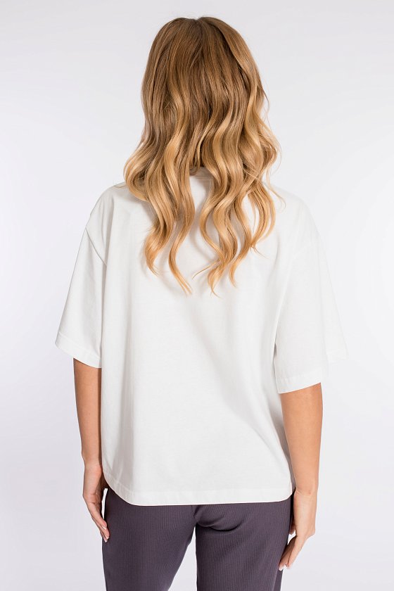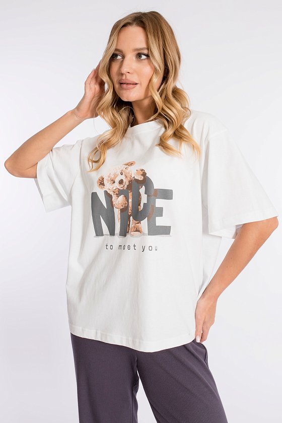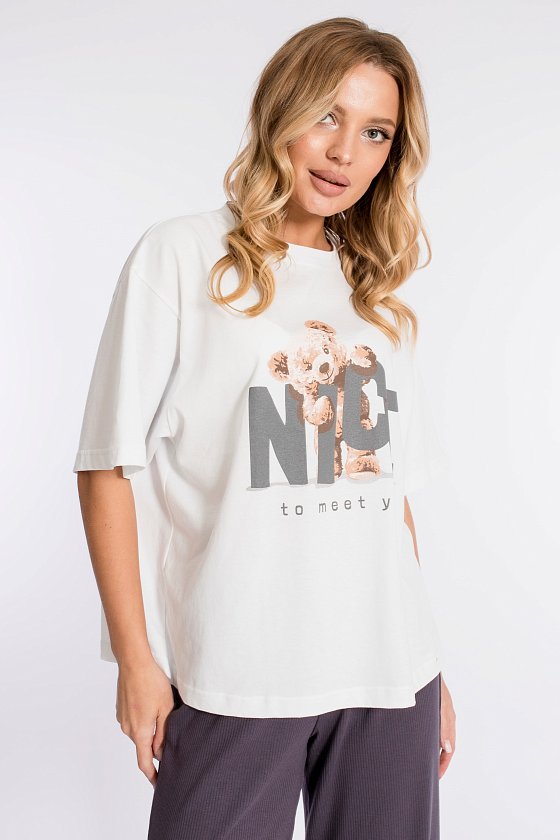 Футболка свободного силуэта выполнена из х/б полотна. Вырез горловины круглый. Спереди нанесён принт.