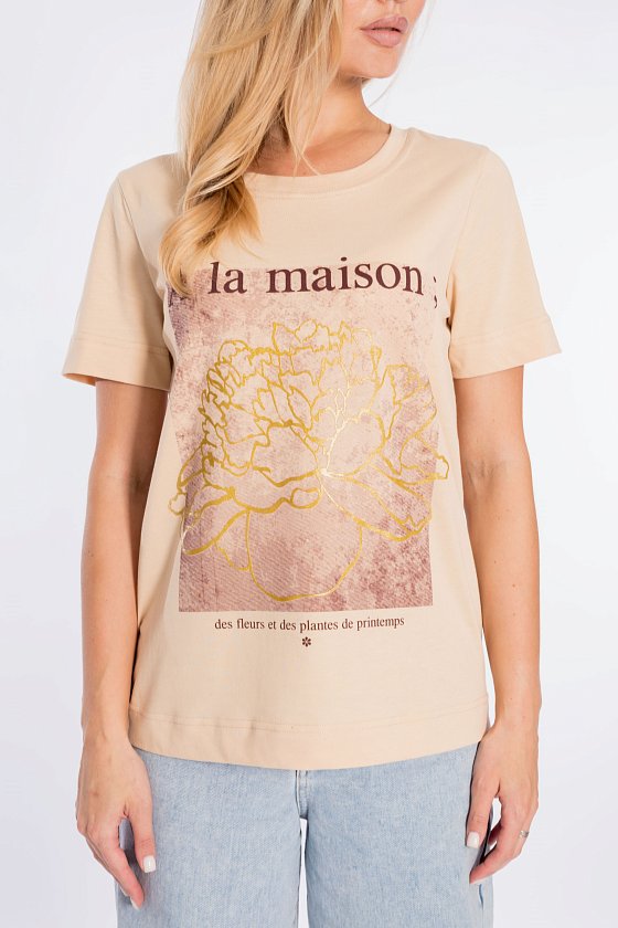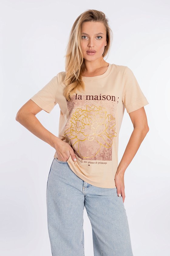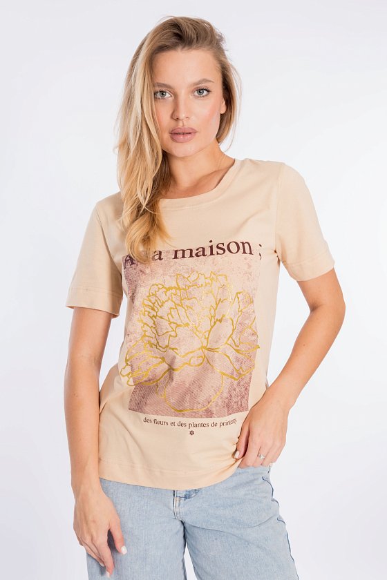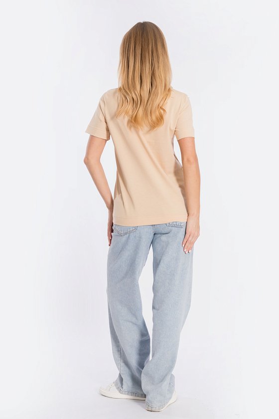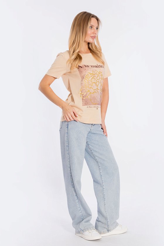 Футболка свободного силуэта из однотонной кулирки, 100% хлопок. С коротким втачным рукавом и притачной планкой по горловине. Спереди нанесён принт.