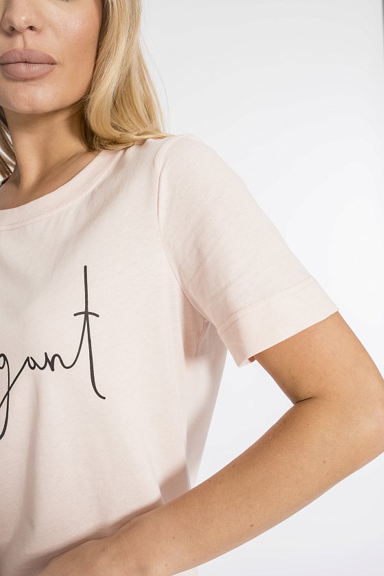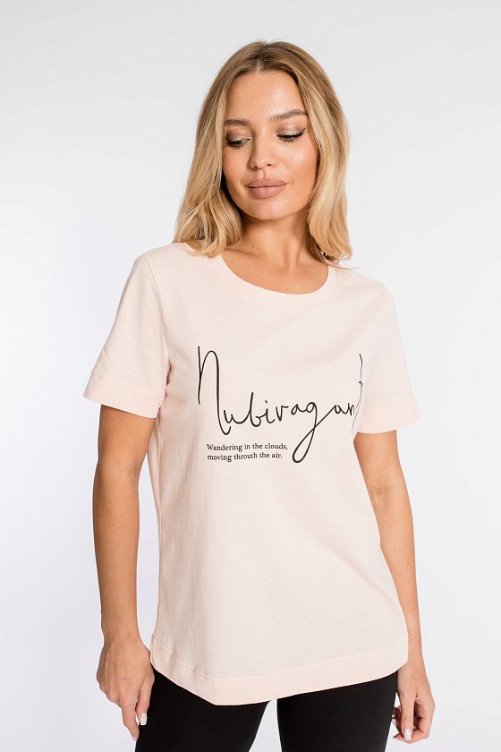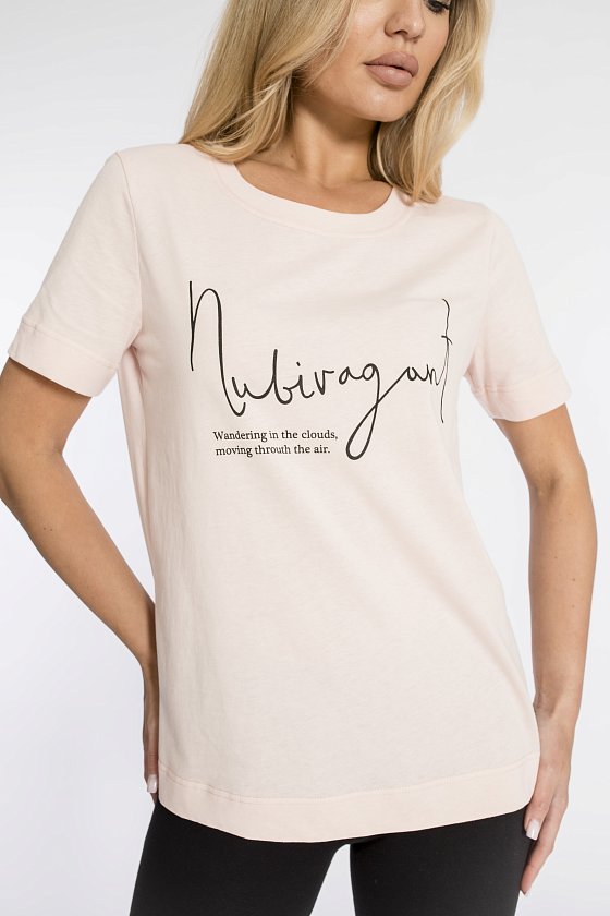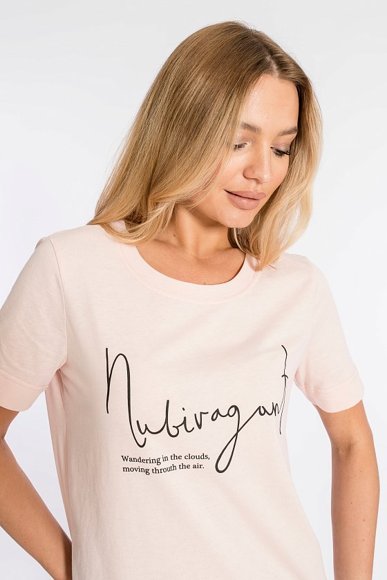 Футболка из однотонной кулирки, 100% хлопок. С коротким втачным рукавом и притачной планкой по круглому вырезу горловины. Спереди нанесён принт.