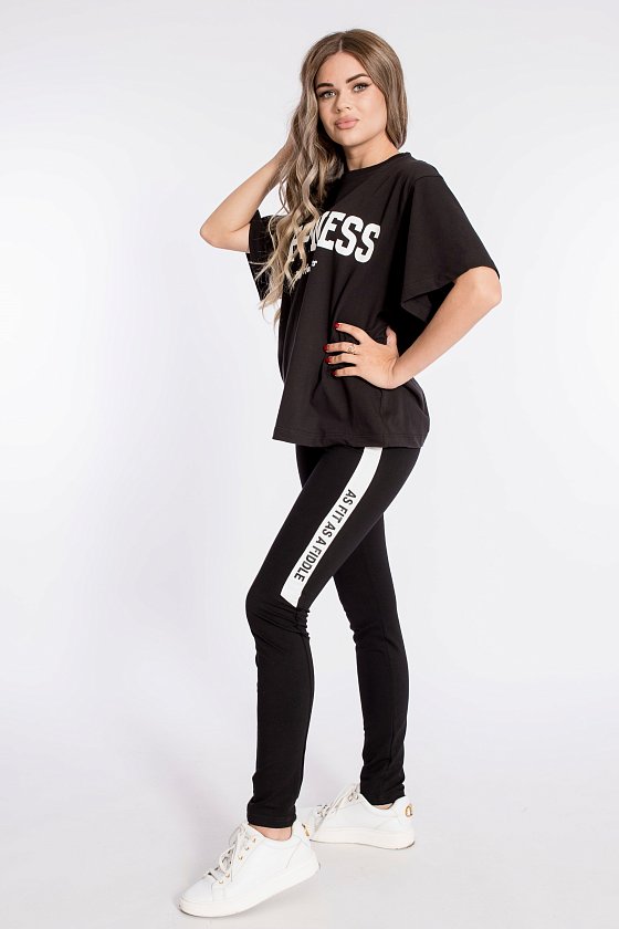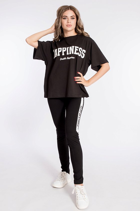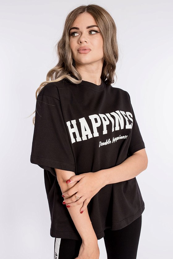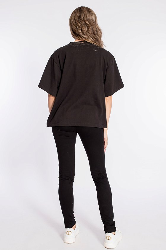 Футболка свободного силуэта выполнена из х/б полотна. Круглый вырез горловины оформлен планкой. Спереди нанесён принт.