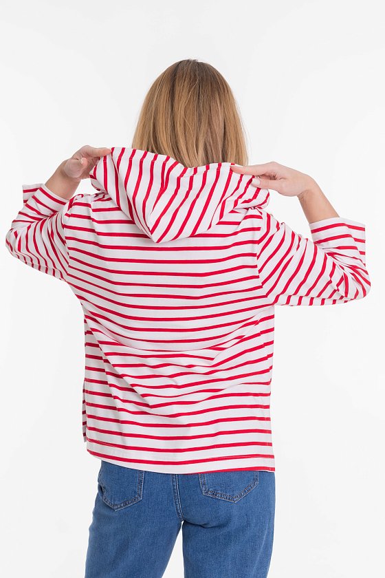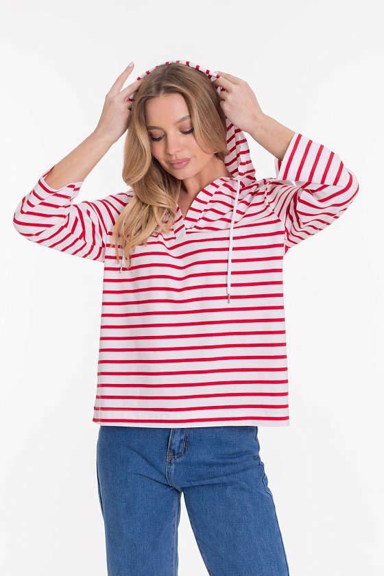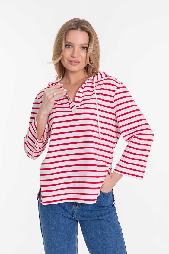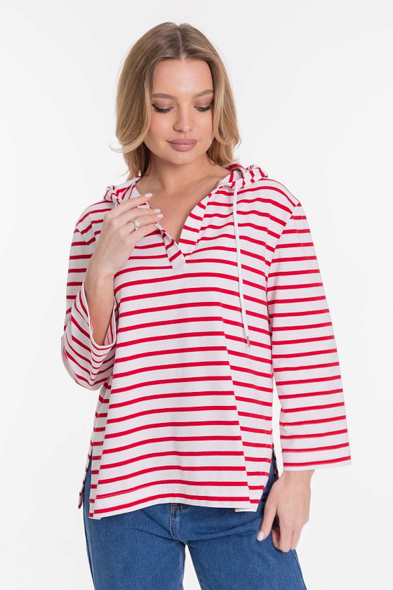 Футболка в полоску выполнена из кулирки с лайкрой. С капюшоном со шнуром и рукавом длиной 3/4. Горловина с V-образым вырезом с планками, переходящими в капюшон. Внизу изделия, в боковых швах декоративные разрезы.