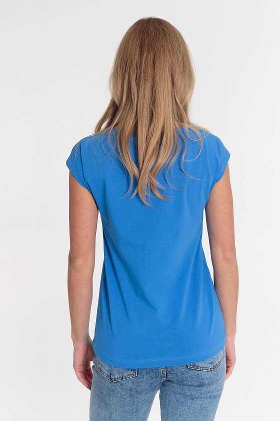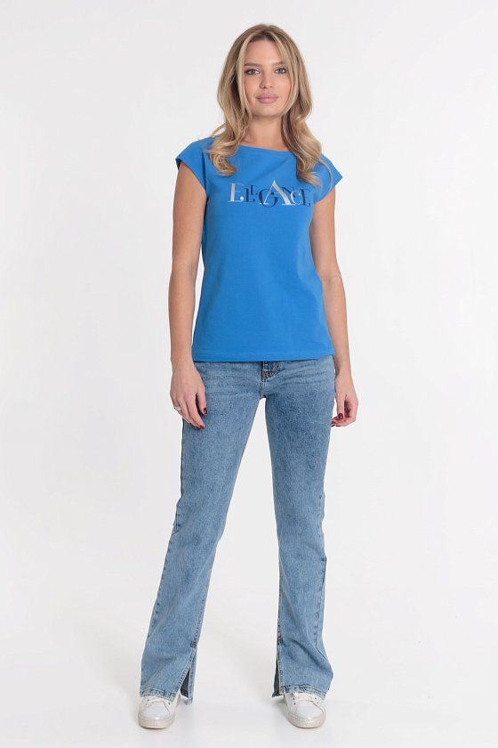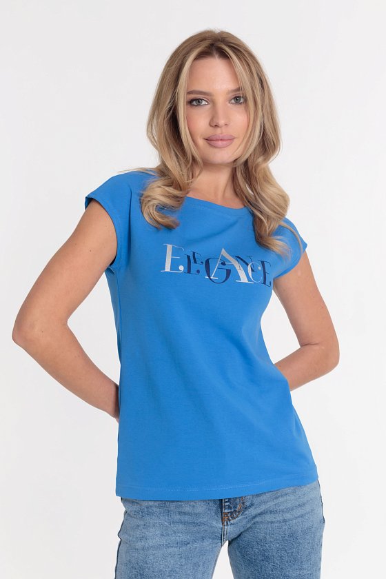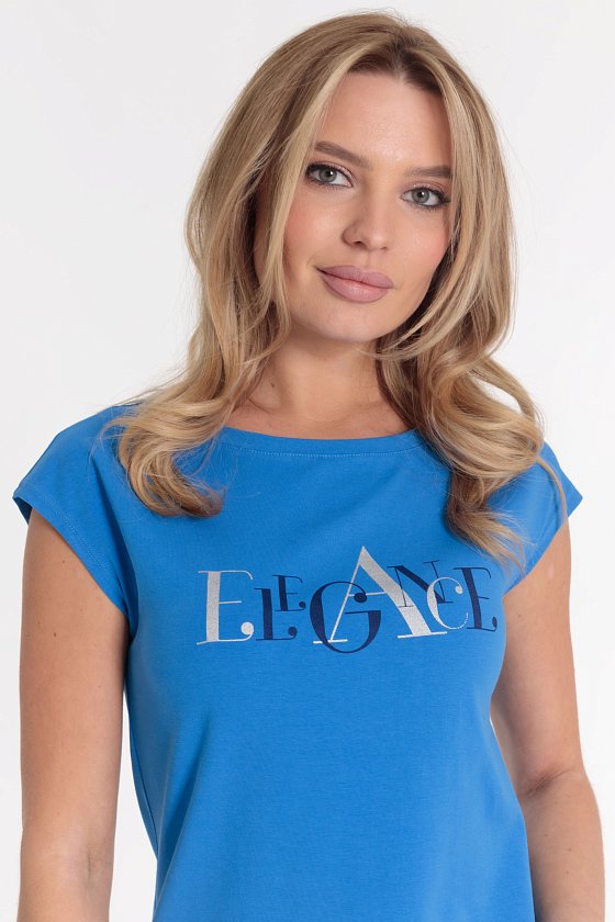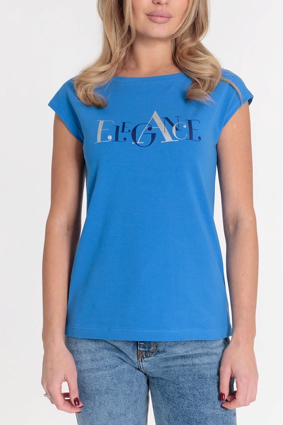 Футболка выполнена из хлопкового полотна c добавлением лайкры. Со спущенной линией плеча и горловиной лодочка. Спереди нанесён принт.