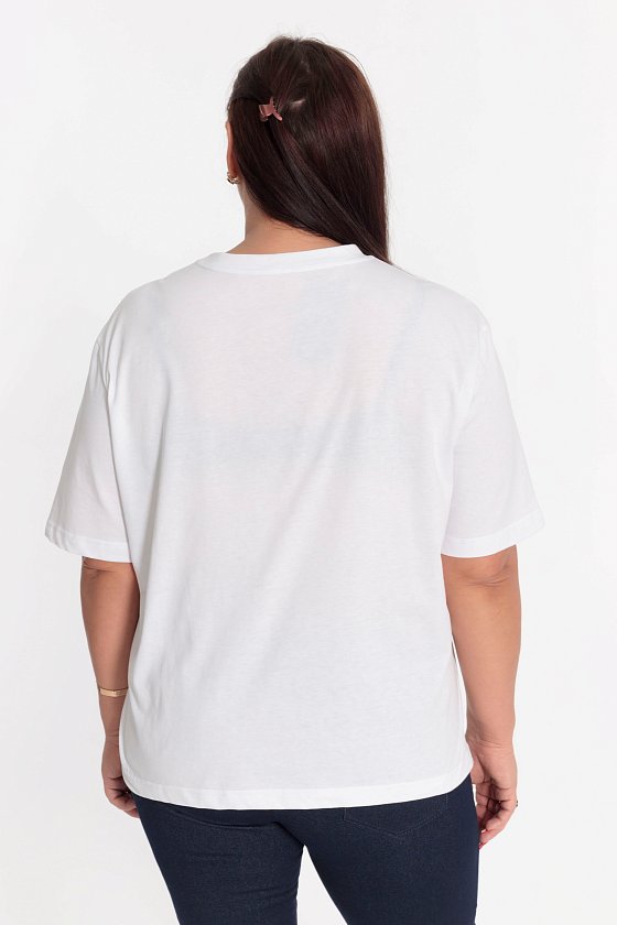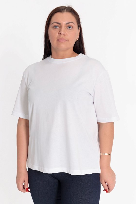 Футболка выполнена из однотонной кулирки, 100% хлопок. С коротким рукавом и круглым вырезом горловины, оформленным планкой. Внизу, в боковых швах декоративные разрезы.