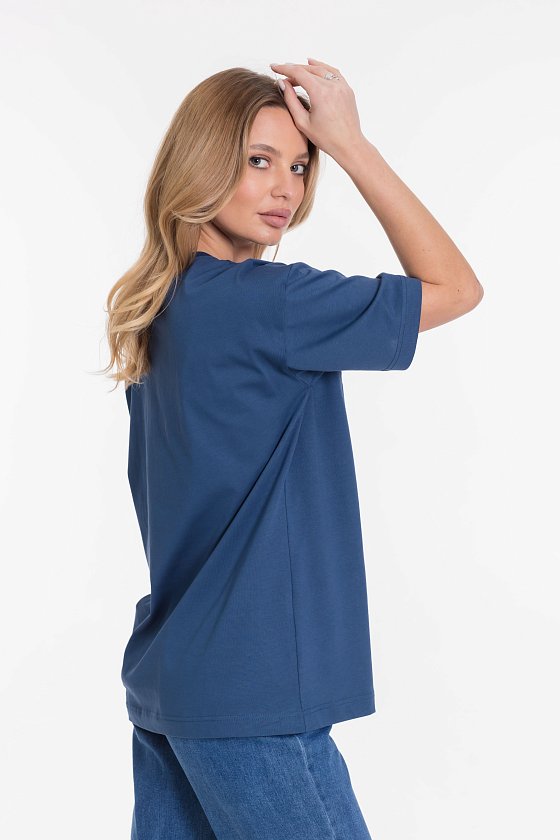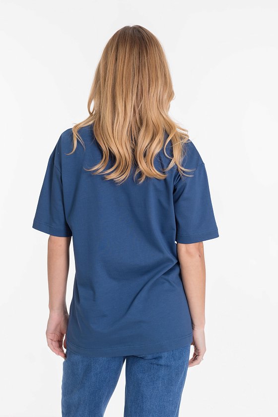 Футболка оверсайз силуэта из однотонной кулирки, 100% хлопок. С коротким рукавом и круглым вырезом горловины, оформленным планкой. Спереди нанесён принт.
