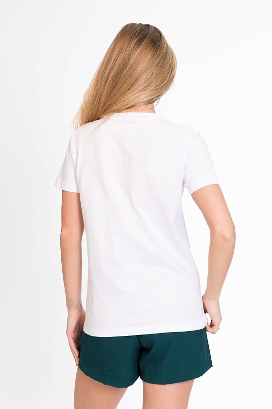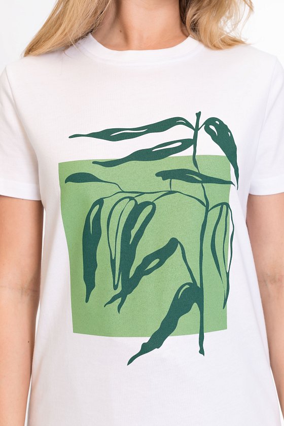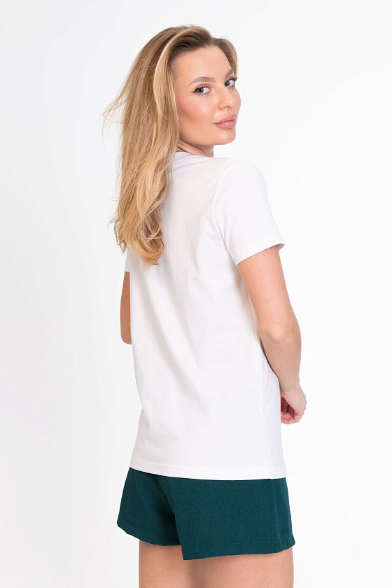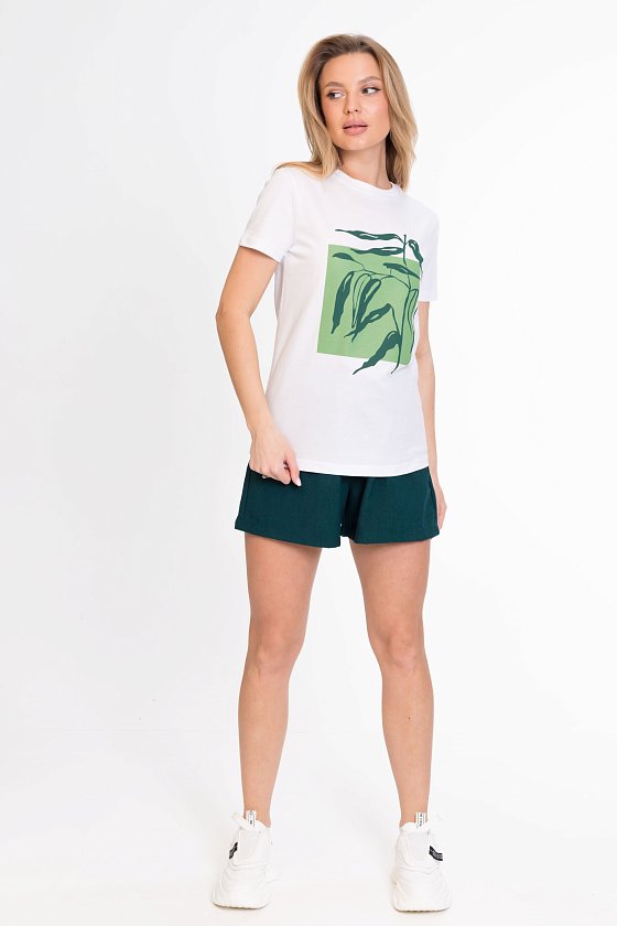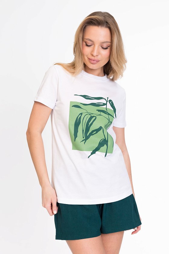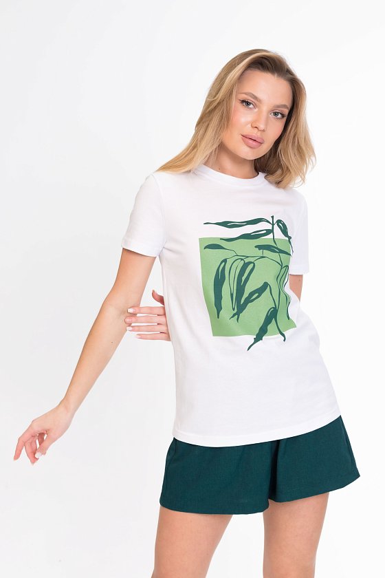 Футболка из однотонной кулирки с коротким втачным рукавом. На полочке принт.