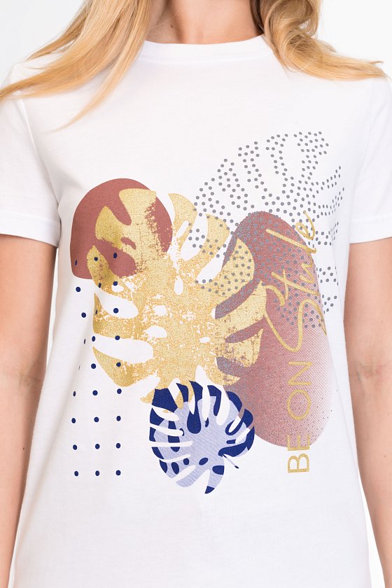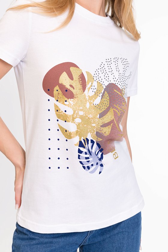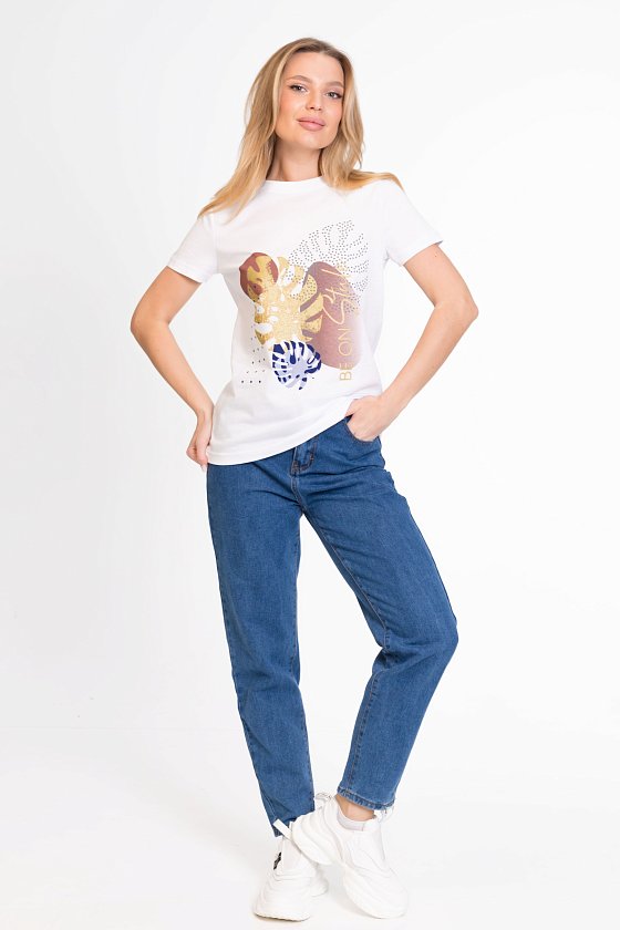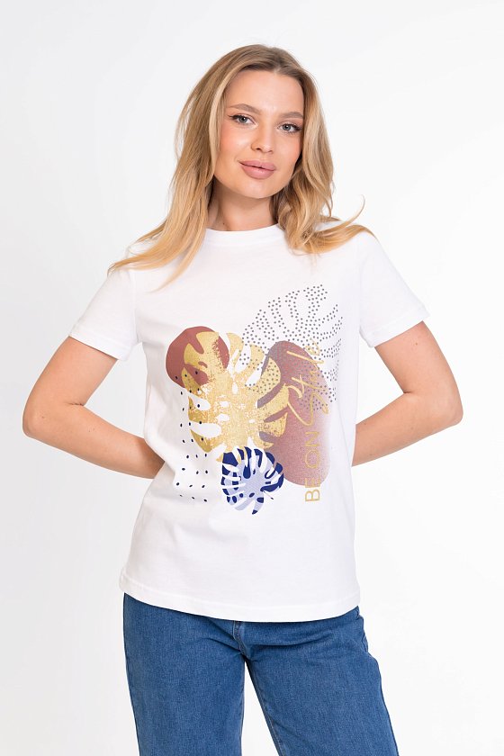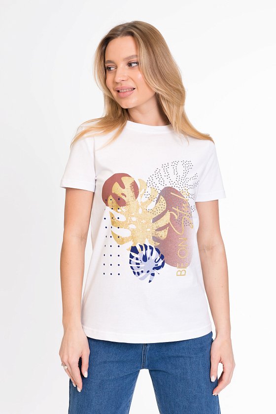 Футболка из однотонной кулирки с коротким втачным рукавом. На полочке принт.